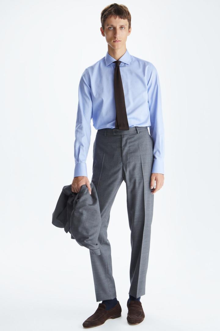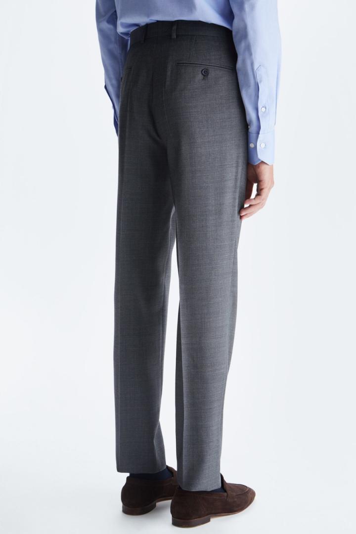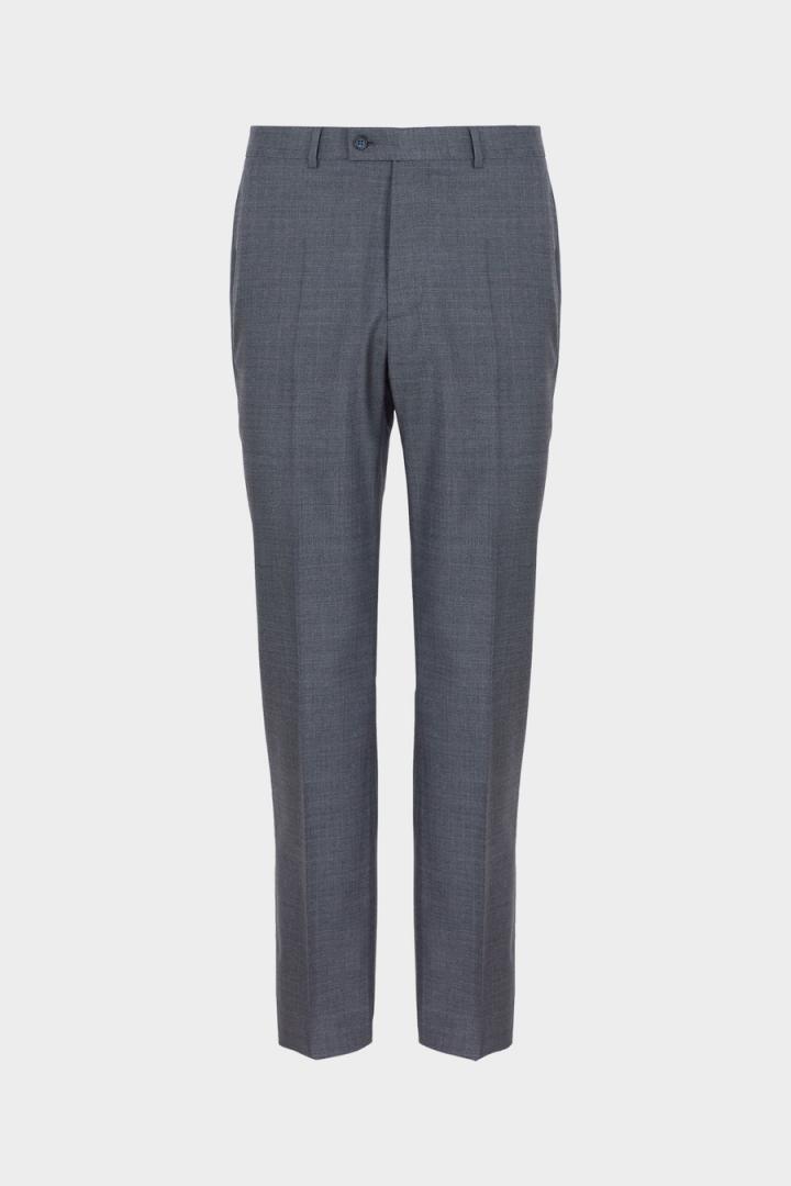 Pantalón de traje classic fit en serreta de lana virgen. Bolsillos laterales y dos bolsillos traseros con doble vivo y botón. Tiene chaqueta de traje a conjunto. El modelo mide 187 cm y lleva una talla 40.
