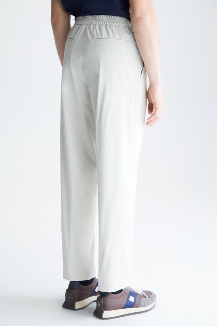 Pantalón de traje relaxed fit en micro sarga de nylon técnico. Cierre de gancho, cremallera y botón ocultos, cinturilla elástica en espalda y base ancha. Dos bolsillos laterales y dos bolsillos traseros de vivo. Tiene chaqueta de traje a conjunto. El modelo mide 187 cm y lleva una talla 40.