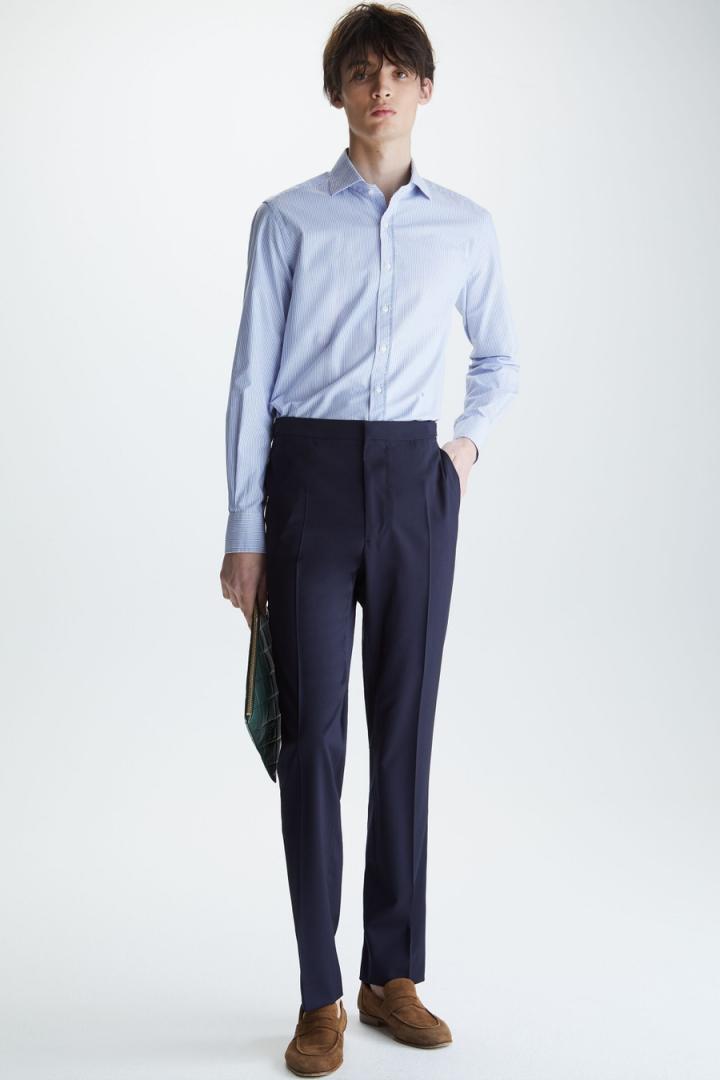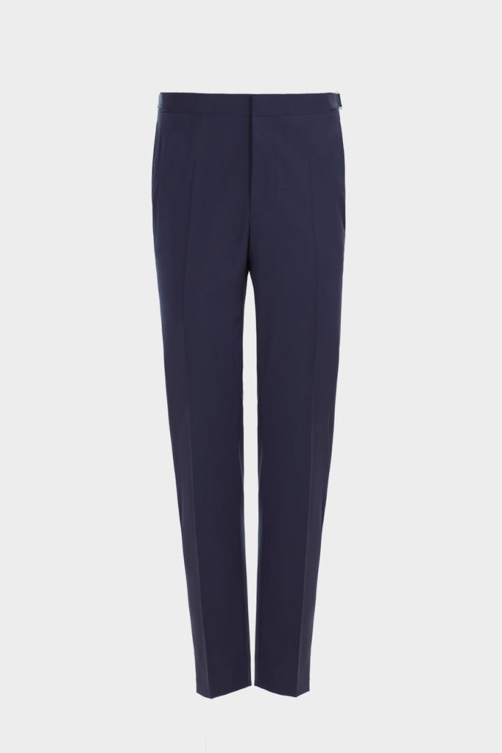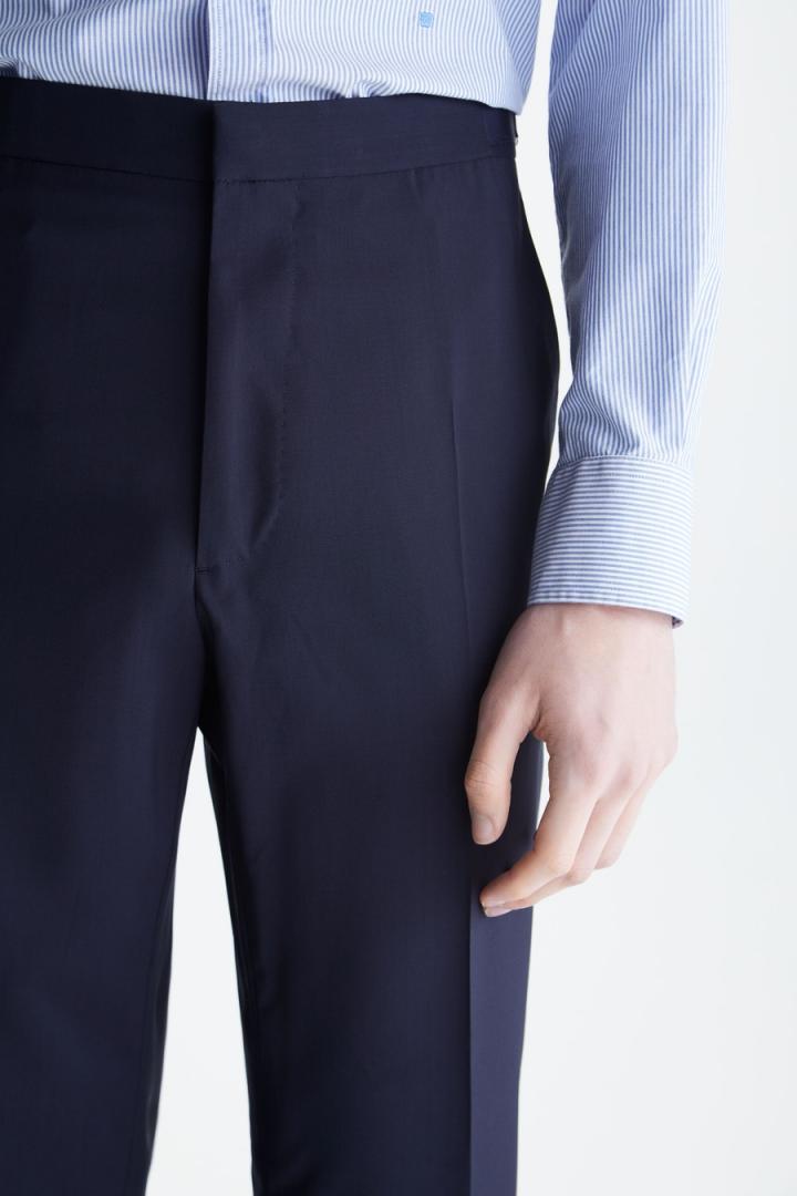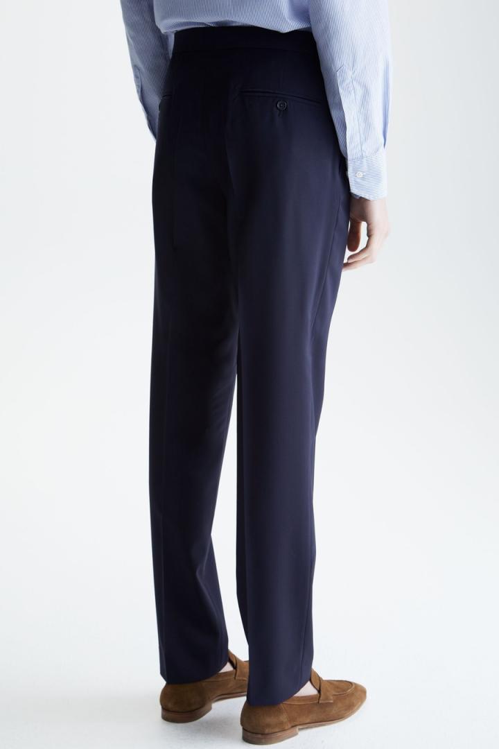 Pantalón regular fit en fresco de lana virgen con cinta de grosgrain bicolor con hebilla ajustable en el lateral. Cierre de botón, gancho y cremallera ocultos, dos bolsillos laterales y dos bolsillos traseros de doble vivo con botón. Hilo de botón en secuencia de colores PG y raya marcada en el delantero. Tiene chaqueta a juego. El modelo mide 189 cm y lleva una talla 40.