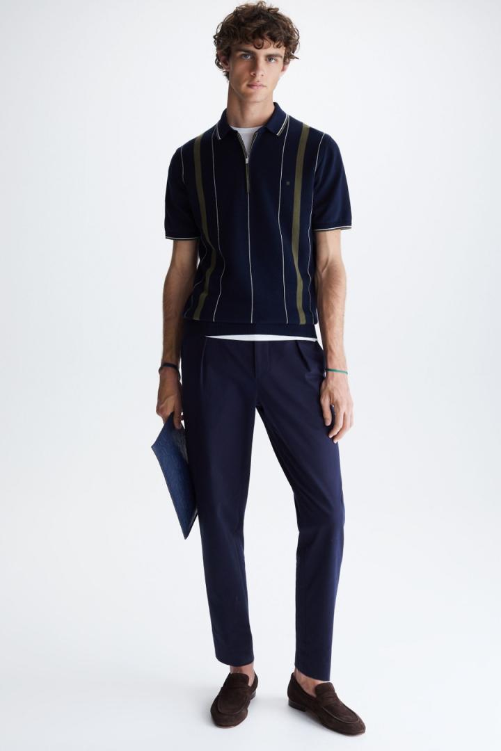 Polo regular fit en punto de algodón pima liso con diseño de rayas y cierre de cremallera hasta el pecho a tono. Cuello polo, manga corta y doble perfil a contraste en cuello y puños. Logo cubo bordado a contraste en el pecho. El modelo mide 190 cm y lleva una talla M.
