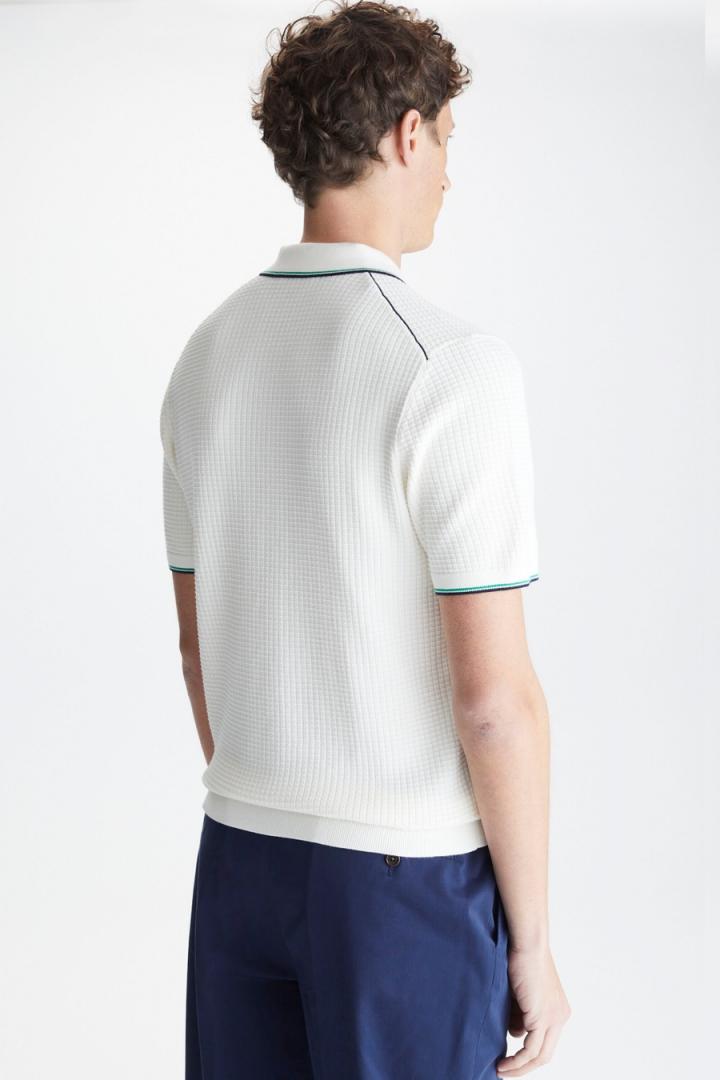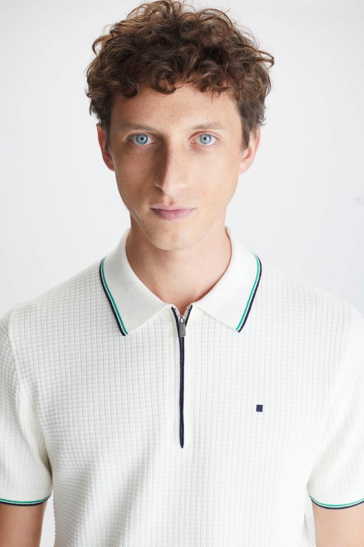 Polo regular fit en estructura de algodón pima con cierre de cremallera hasta el pecho a contraste. Cuello polo, manga corta y doble perfil a contraste en cuello y puños. Logo cubo bordado a contraste en el pecho. El modelo mide 190 cm y lleva una talla M.