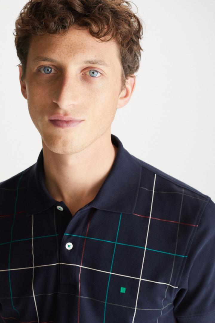 Polo regular fit en piqué de algodón con estampado de cuadro ventana multicolor a contraste en delantero. Cuello clásico con dos botones e hilo de botón a contraste, manga corta y aberturas laterales. Logo cubo bordado a contraste en pecho. El modelo mide 190 cm y lleva una talla M.