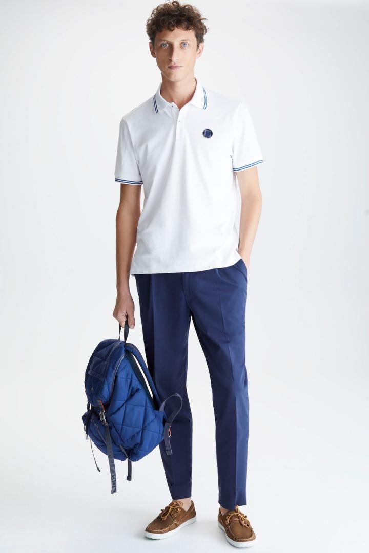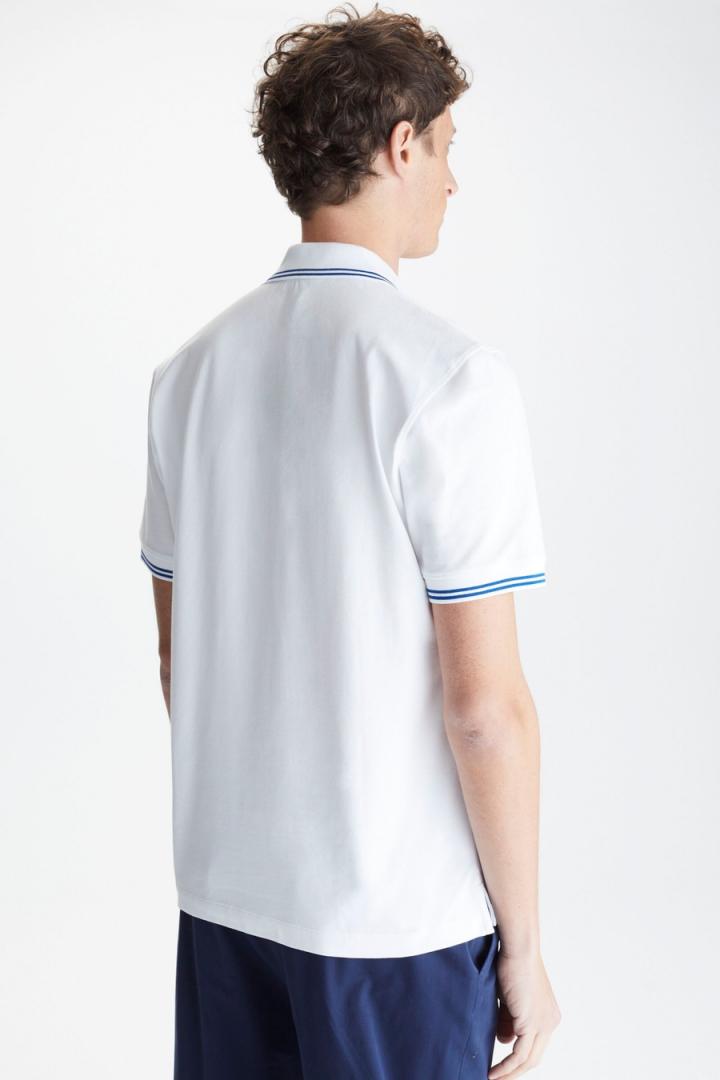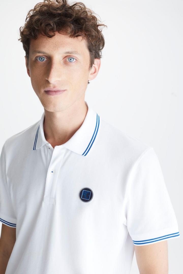Polo regular fit en piqué de algodón stretch con doble raya a contraste en cuello y puños. Cuello clásico con dos botones e hilo de botón a contraste, manga corta y aberturas laterales. Parche PG de goma en pecho. El modelo mide 190 cm y lleva una talla M.
