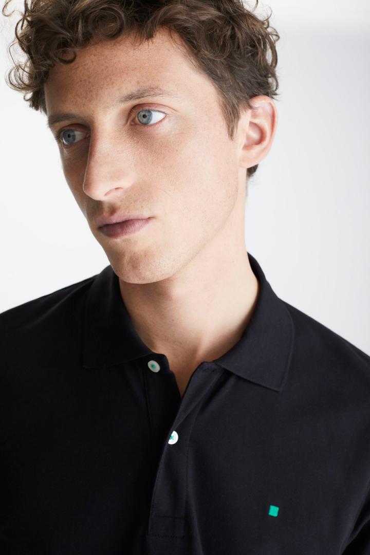 Polo regular fit en piqué de algodón stretch. Cuello clásico con dos botones e hilo de botón a contraste, manga corta y aberturas laterales con cinta en piqué a contraste. Logo cubo bordado a contraste en pecho. El modelo mide 190 cm y lleva una talla M.