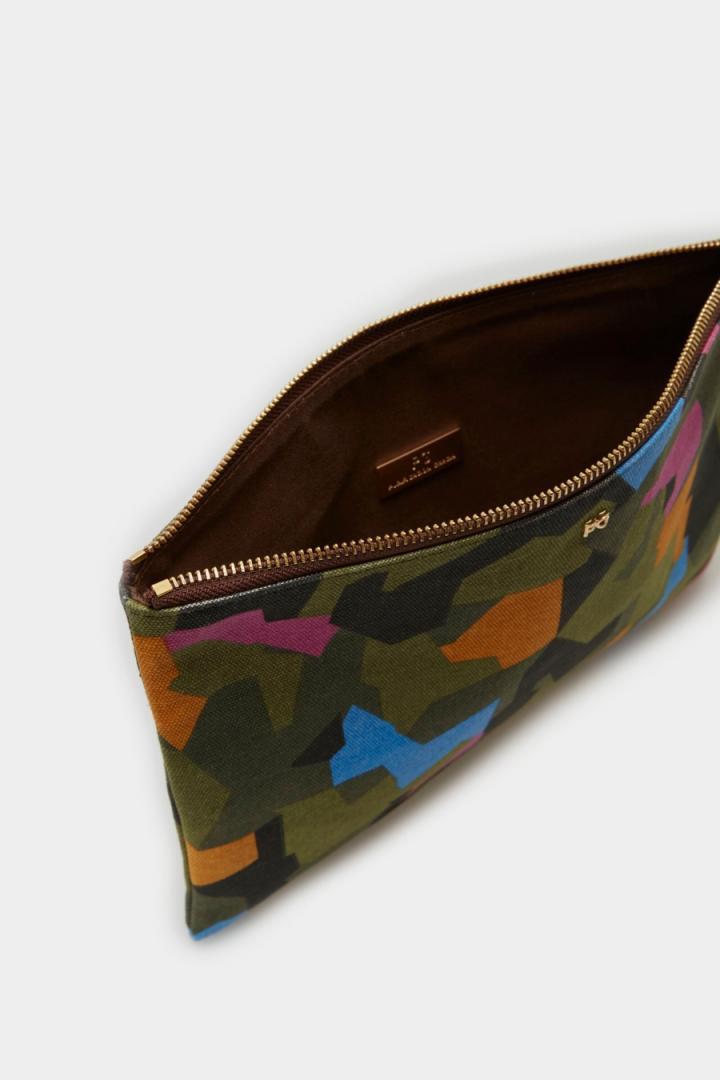 Pouch grande elaborado en lona de algodón con estampado de camuflaje geométrico multicolor. Cierre de cremallera con tirador de piel e interior con forro completo de algodón. Detalle de logo PG metálico.