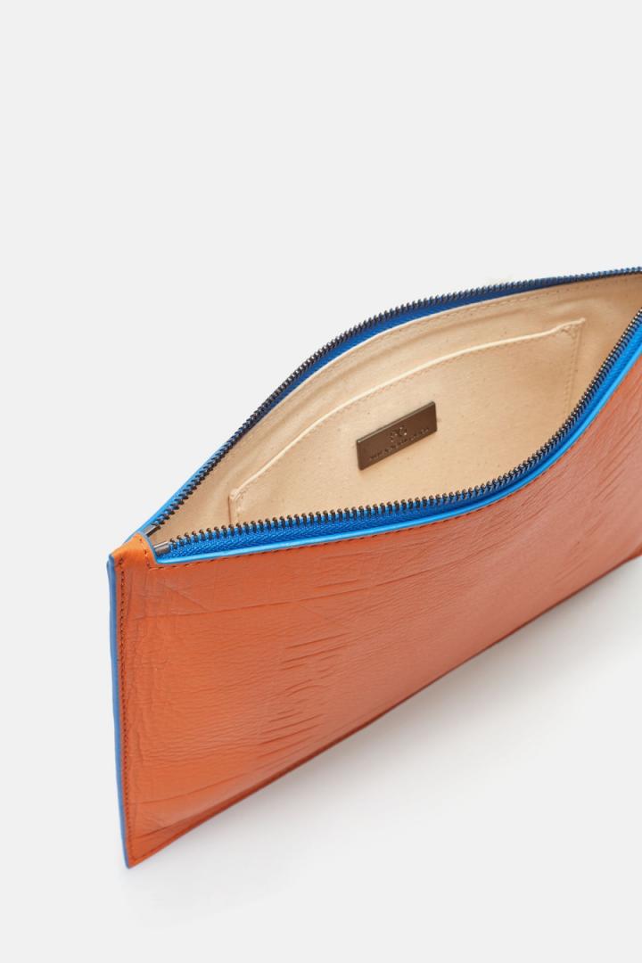 Pouch grande en piel con grabado Cinta PG y lujado a contraste. Cierre de cremallera con tirador de piel. Interior con forro completo de algodón y un bolsillo parche.