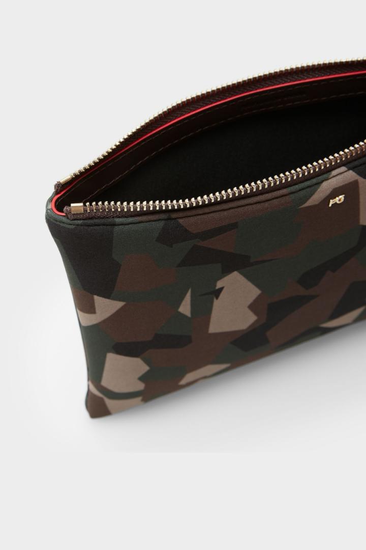 Pouch mediano en neopreno con estampado de camuflaje y detalle de logo PG metálico. Cierre de cremallera con tirador en piel. Interior…