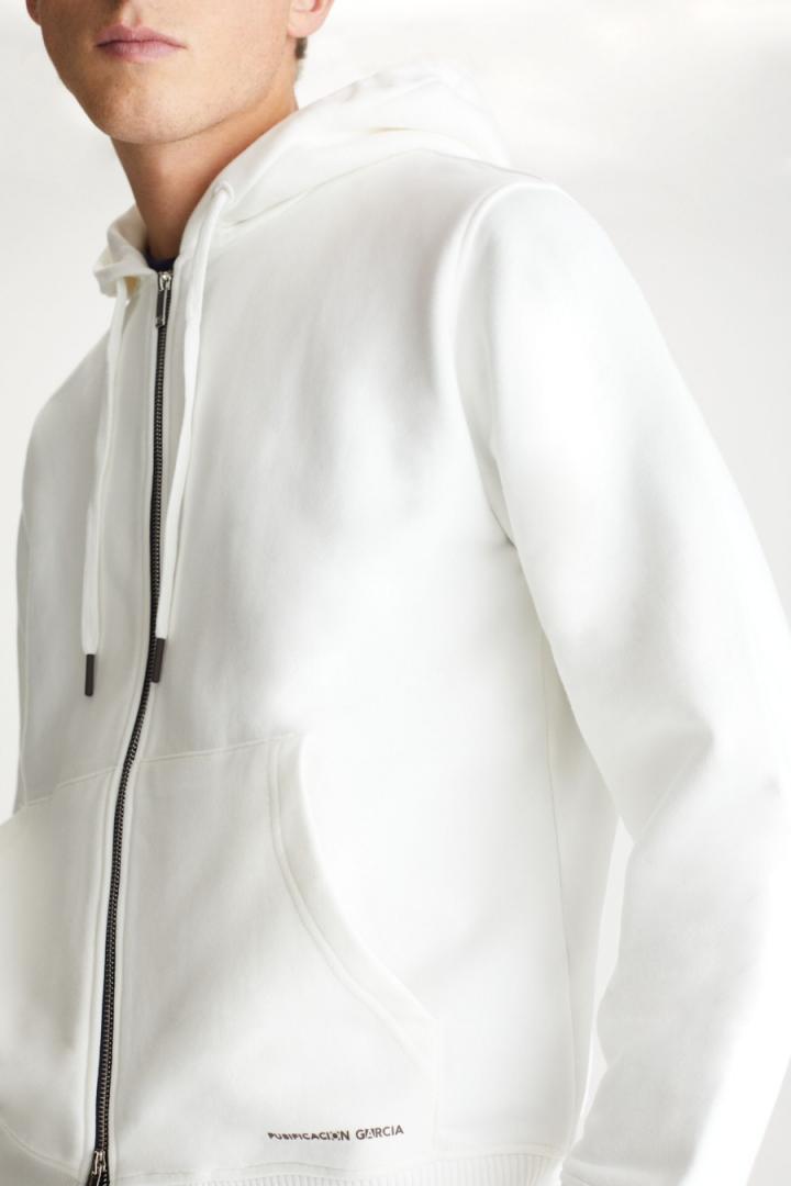 Sudadera regular fit en felpa de algodón con logo Purificacion Garcia estampado en relieve a contraste en bajo delantero. Cuello con capucha y cordón a tono y cierre de cremallera personalizada de doble cursor a contras…