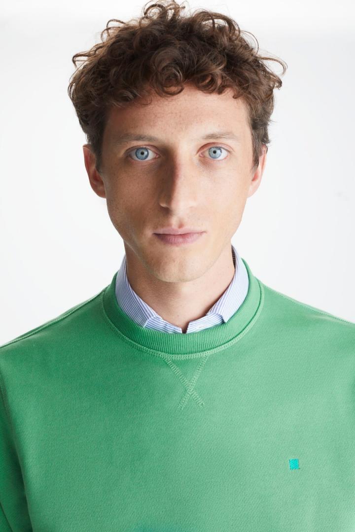 Sudadera regular fit en felpa de algodón. Cuello redondo con triángulo decorativo, manga larga y cuello, puños y bajo acanalados. Cubo bordado a contraste en el pecho. El modelo mide 190 cm y lleva una talla M….
