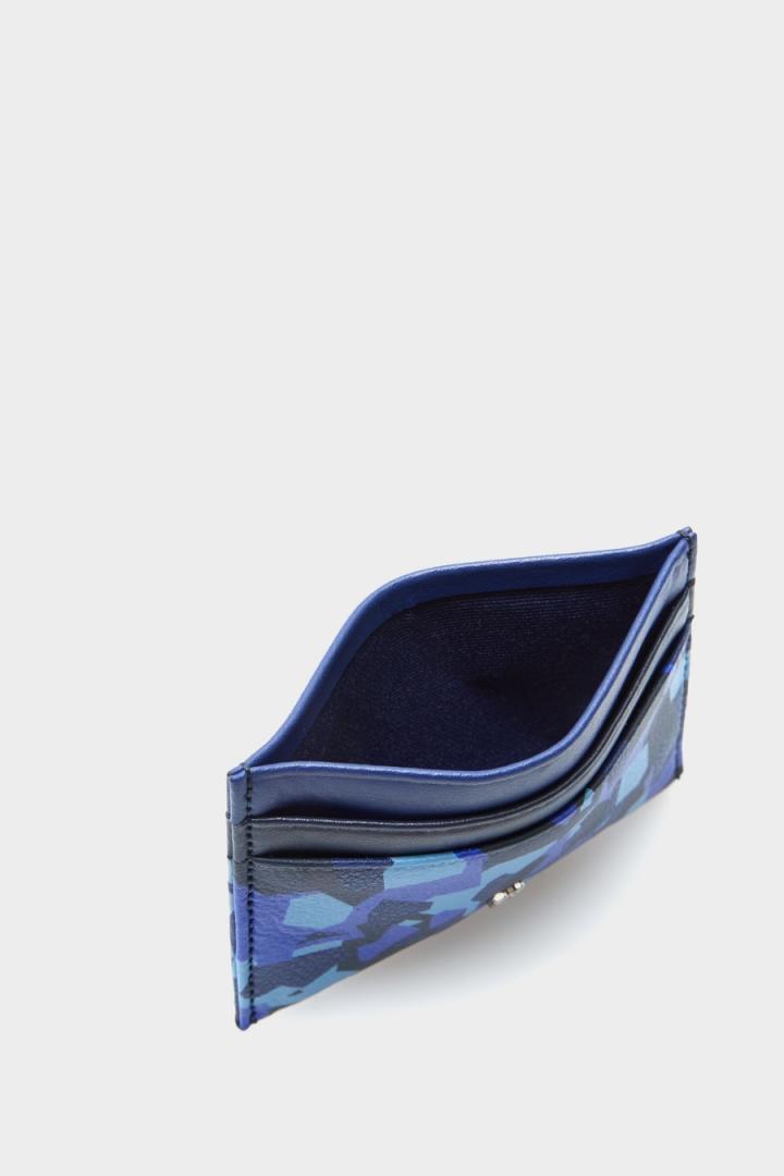 Tarjetero en piel con estampado de camuflaje geométrico. Detalle de logo PG a contraste.