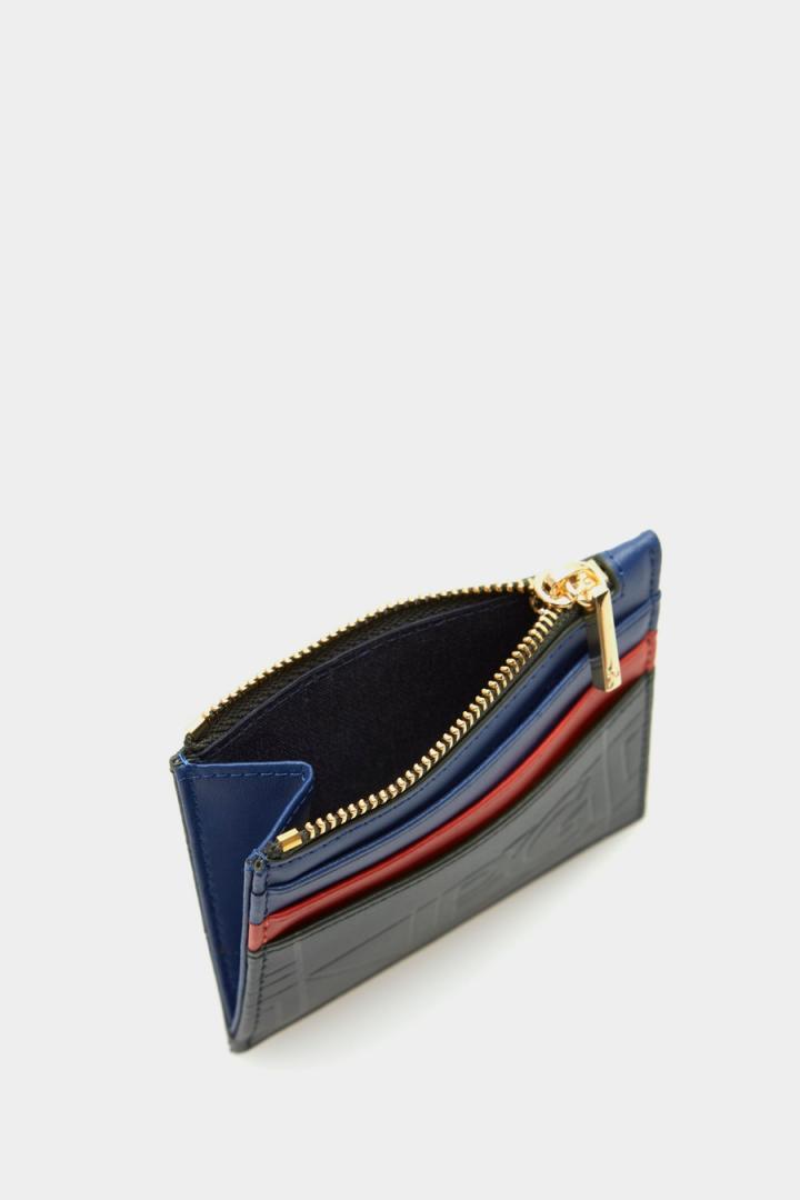 Tarjetero en piel con grabado Stamp de Cinta PG. Monedero con cierre de cremallera y tres ranuras para tarjetas.