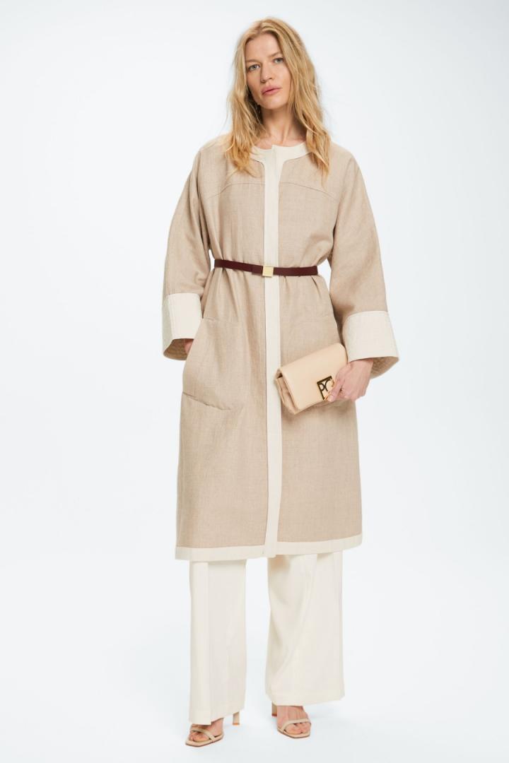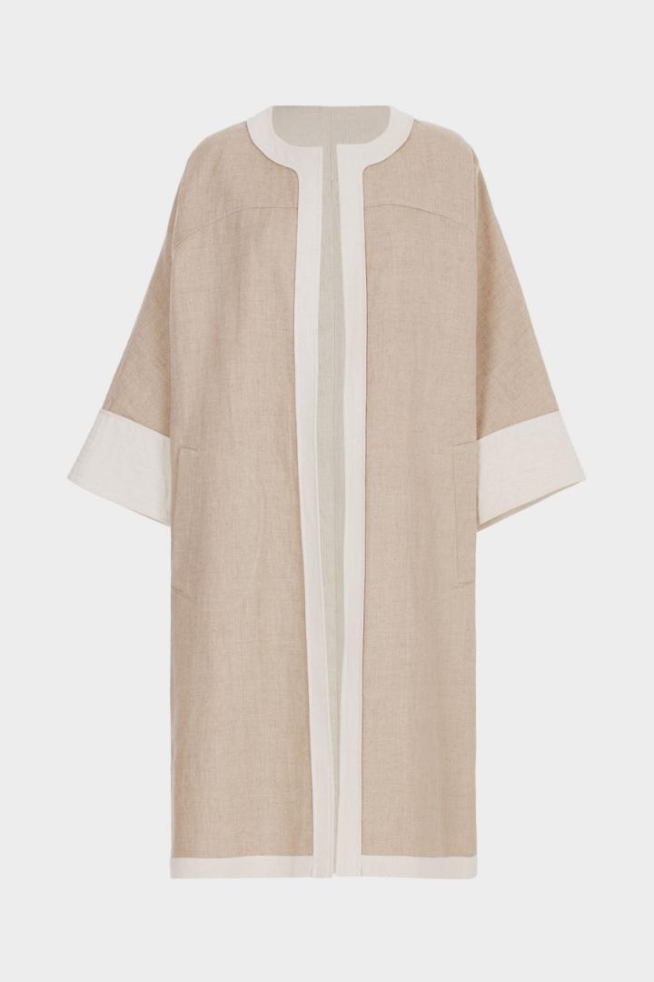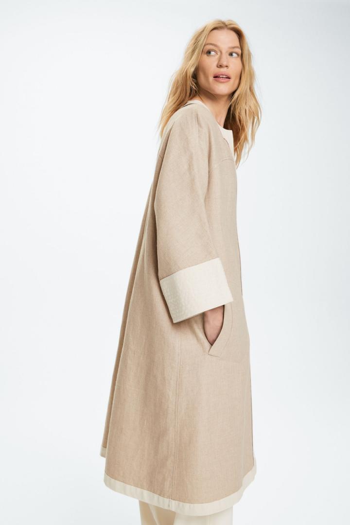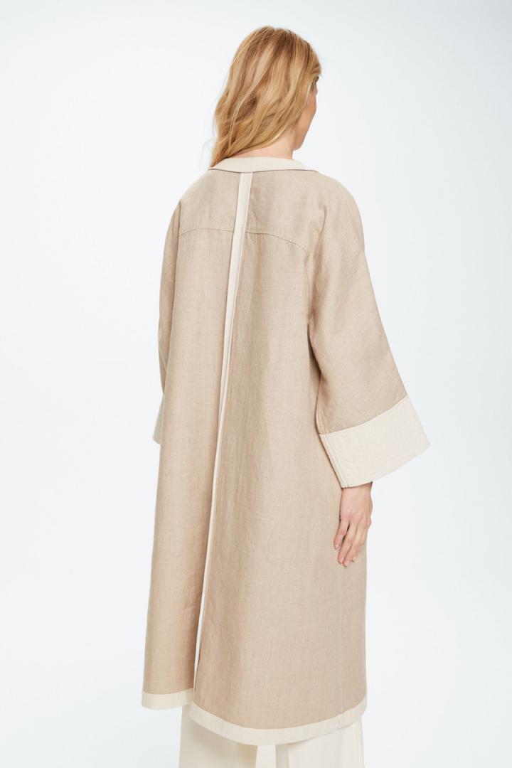 Abrigo sin cierre de línea evasé en mezcla de lino y algodón doble faz con ribetes y puños anchos a contraste. Cuello redondo, manga ancha, canesú en pecho y espalda y bolsillos laterales tipo parche. La modelo mide 176 cm y lleva una talla XS.