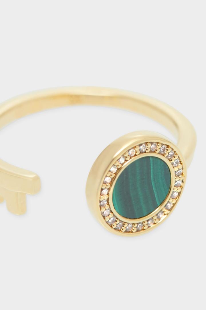Anillo abierto y ajustable bañado en oro. Detalle de llave con interior de malaquita y detalle de circonitas.