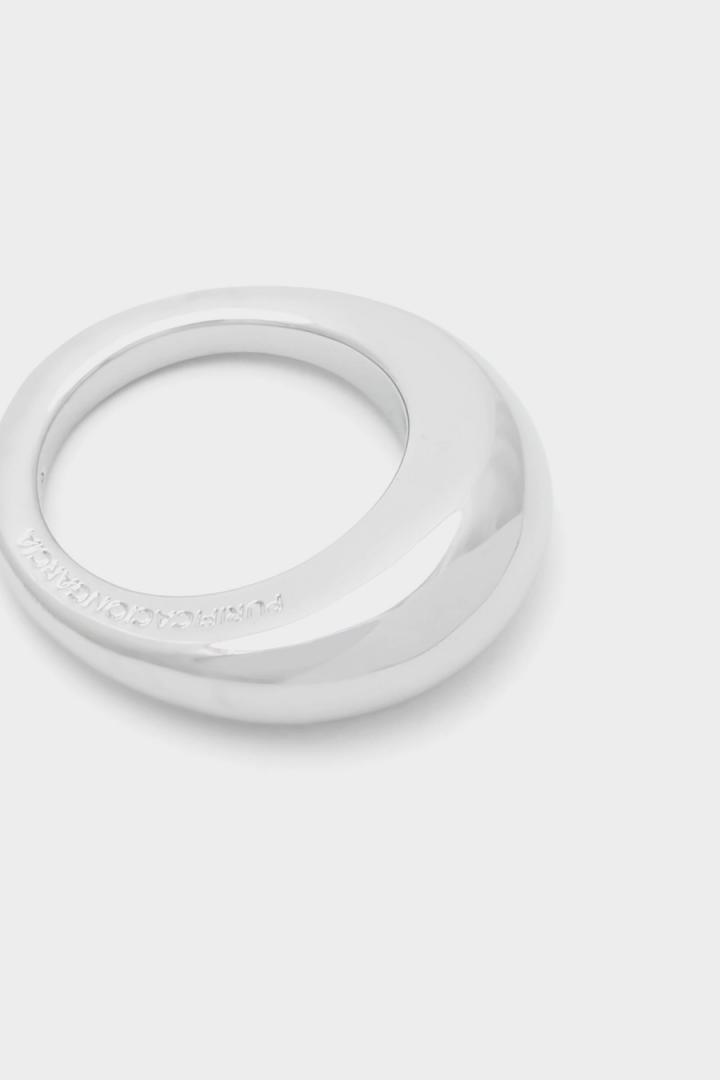 Anillo bañado en rodio con forma redondeada y detalle de logo grabado.
