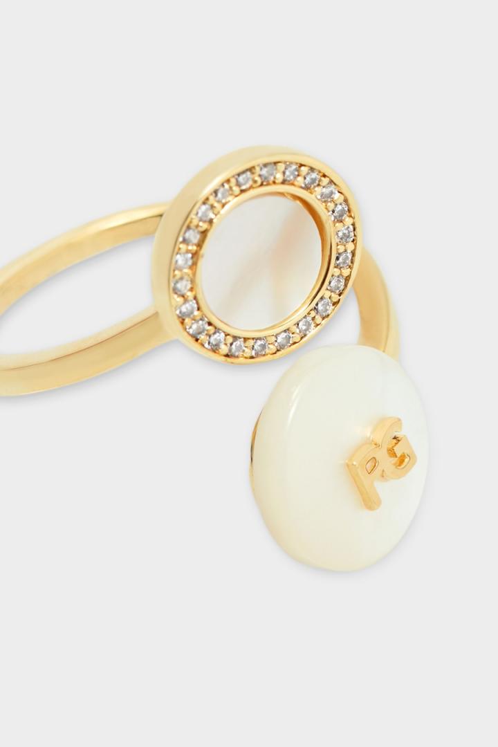 Anillo bañado en oro con detalles de dos medallas de madre perla con logo PG y cristales.