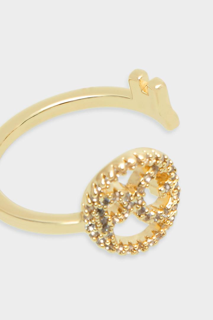 Anillo bañado en oro en forma de llave personalizada con logo PG y detalle de cristal.