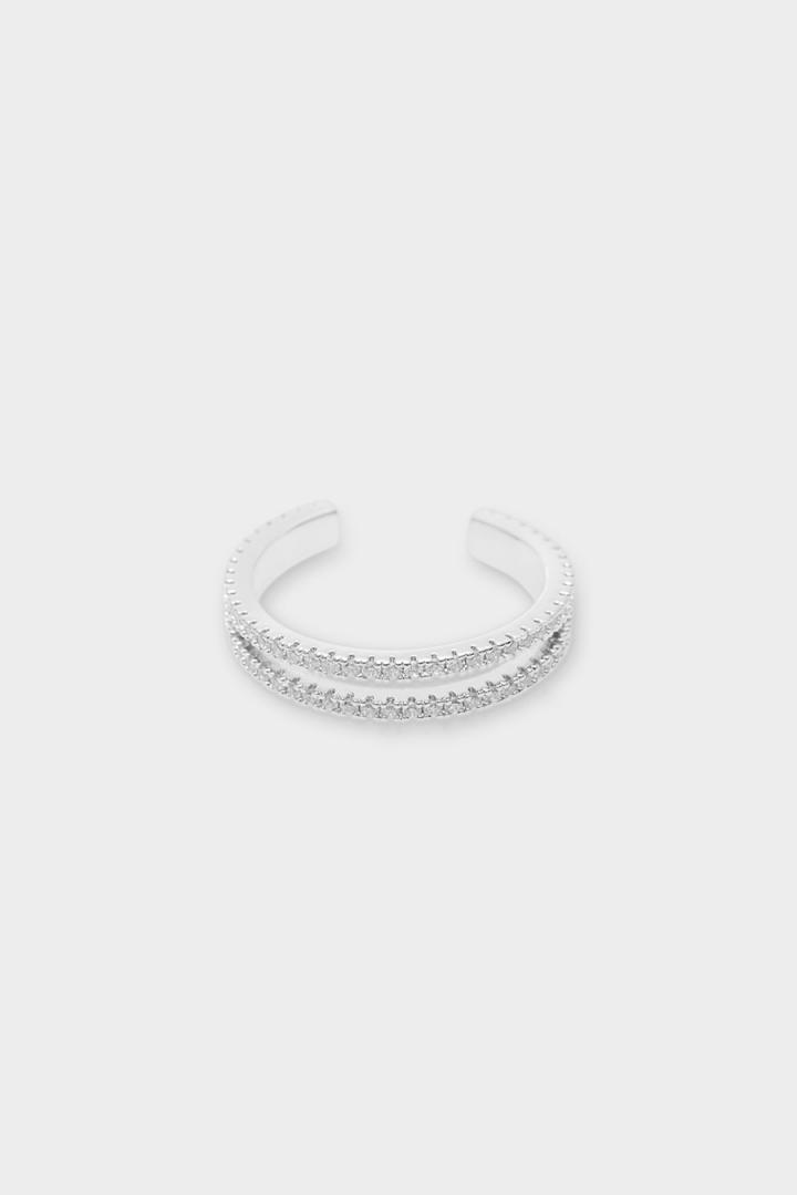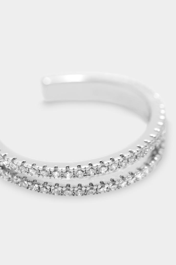 Anillo bañado en rodio formado por dos bandas con cristales incrustados.