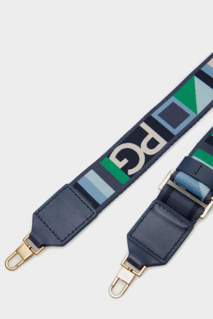 Asa bandolera regulable confeccionada en grosgrain con diseño Cinta PG, mosquetones en los extremos y detalles en piel.