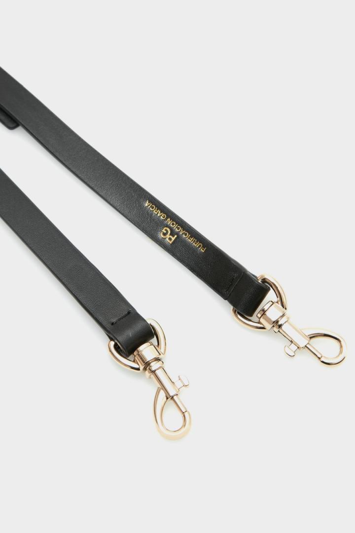 Asa bandolera confeccionada en piel con mosquetones en los extremos y detalles métalicos logotipados.