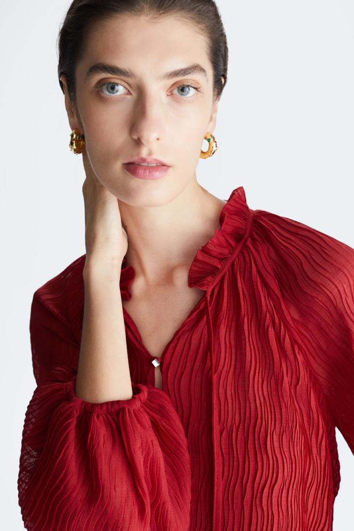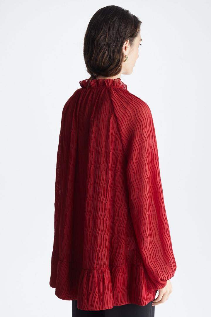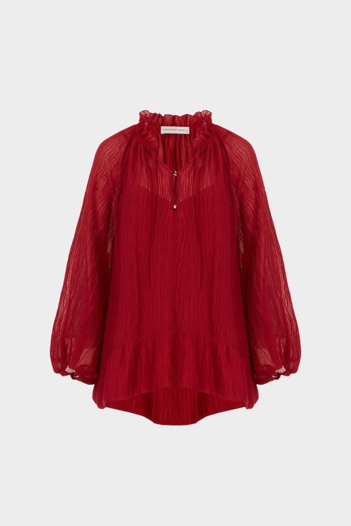 Blusa de línea evasé en bambula semitransparente con volante en cuello y bajo. Cuello redondo con abertura frontal cerrada con botones joya y cordones. Manga larga ranglan abullonada con puño fruncido y ajustado. La modelo mide 177 cm y lleva una talla S.