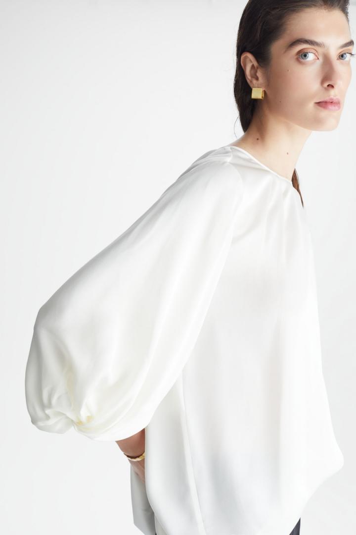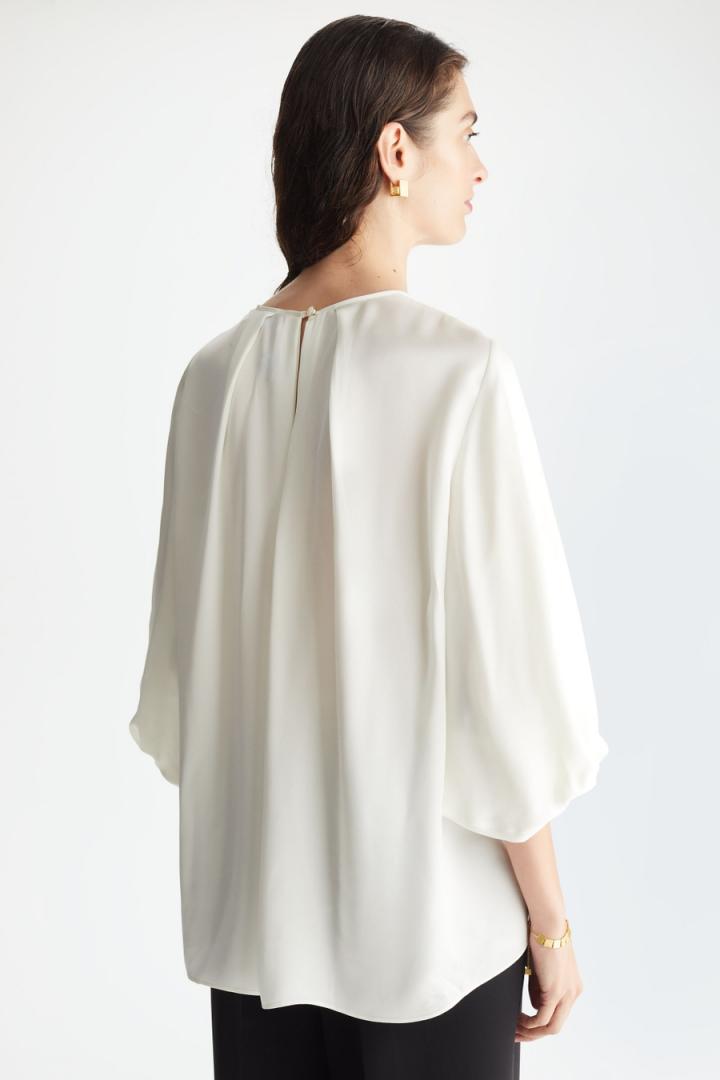 Blusa de línea evasé con manga abullonada y diseño de pliegues en el delantero y la espalda. Cuello redondo con cierre de lágrima y botón joya en la espalda, manga francesa y puño recogido. La modelo mide 177 cm y lleva una talla S.