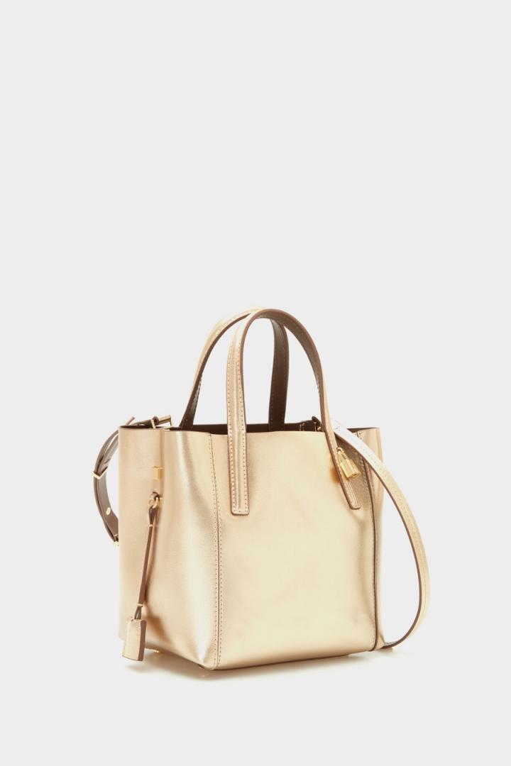 Bolso bandolera pequeño en piel con detalle de candado metálico personalizado. Dos asas mano y asa bandolera regulable y extraíble, ambas de piel. Interior de piel con cierre de tira con broches y un bolsillo de cremallera.