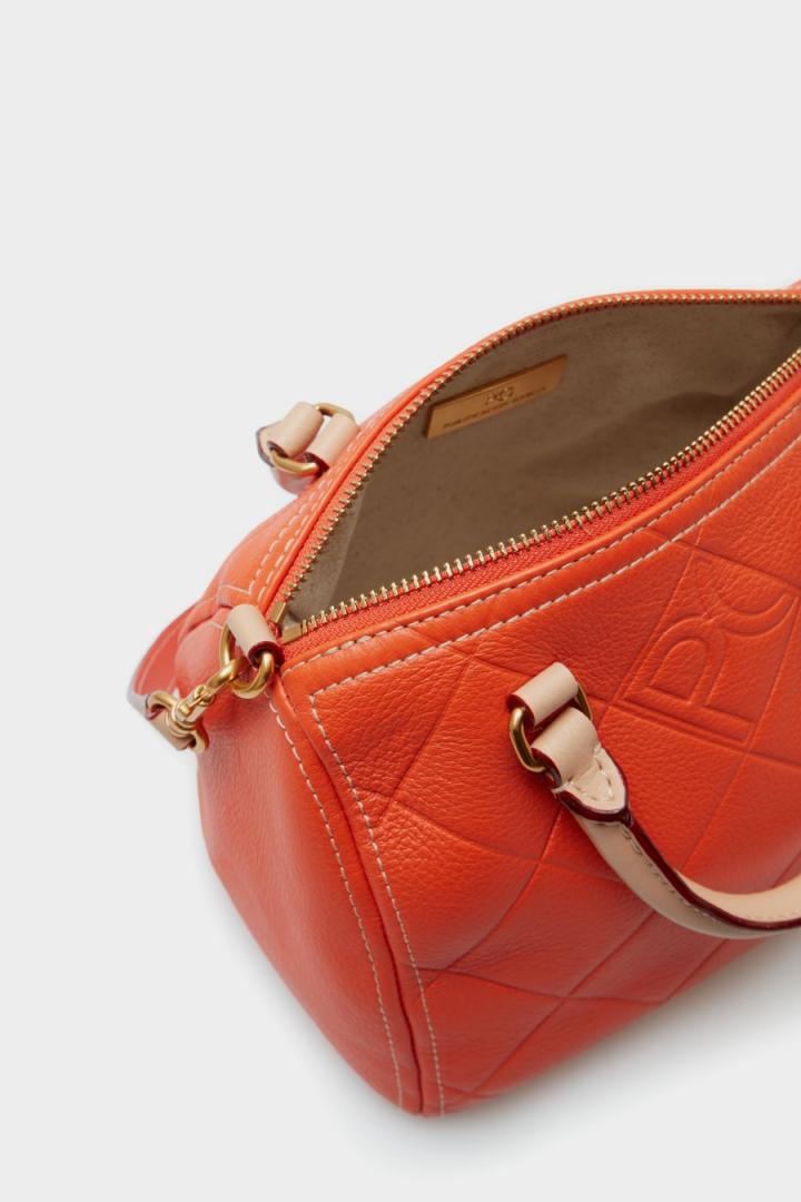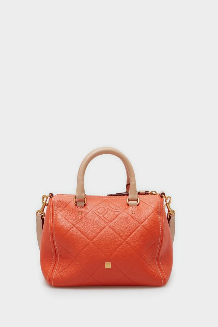Bowling pequeño en piel con grabado Stamp de cubos y logo PG y pespuntes a contraste. Asa bandolera y doble asa de mano en piel con lujado a contraste y cierre de cremallera con tiradores a contraste. Interior con forro completo de algodón y lino y detalle de cubo metálico con logo PG grabado en la parte trasera.