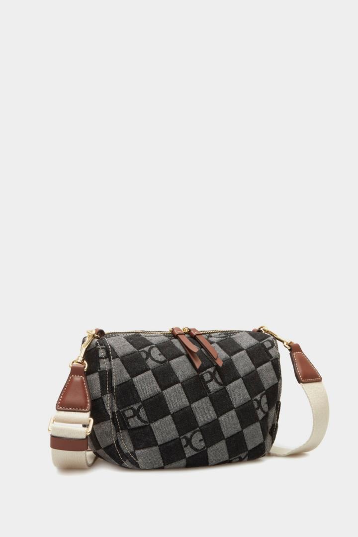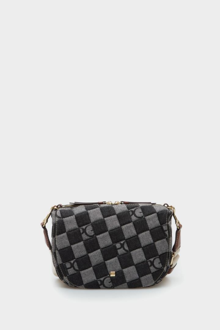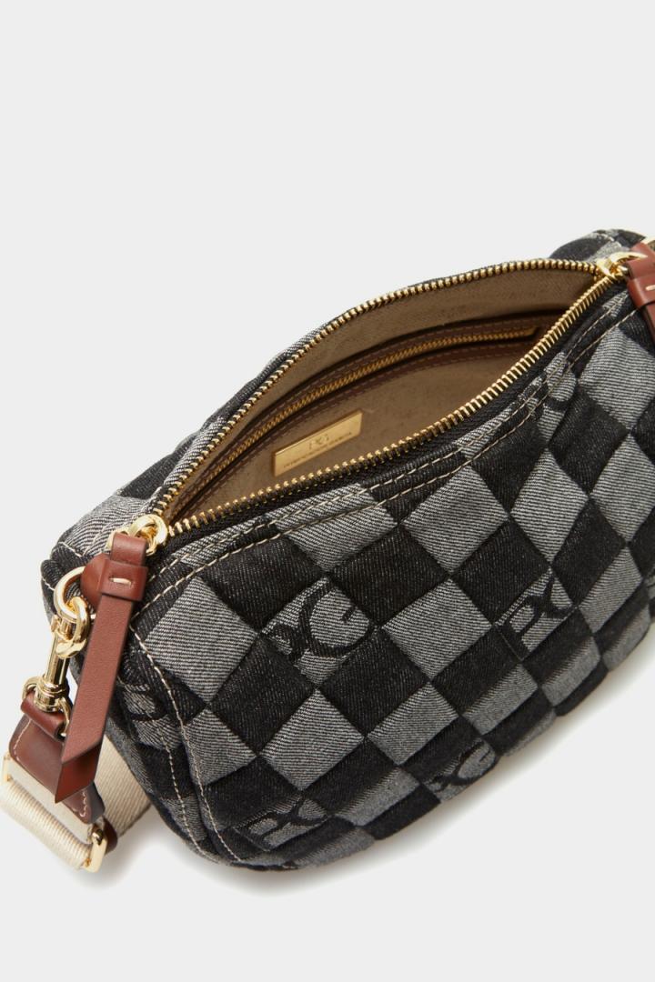 Bolso bandolera pequeño en canvas de algodón con jacquard de cubos Lona Cubos Denim. Asa regulable y extraíble en gr…