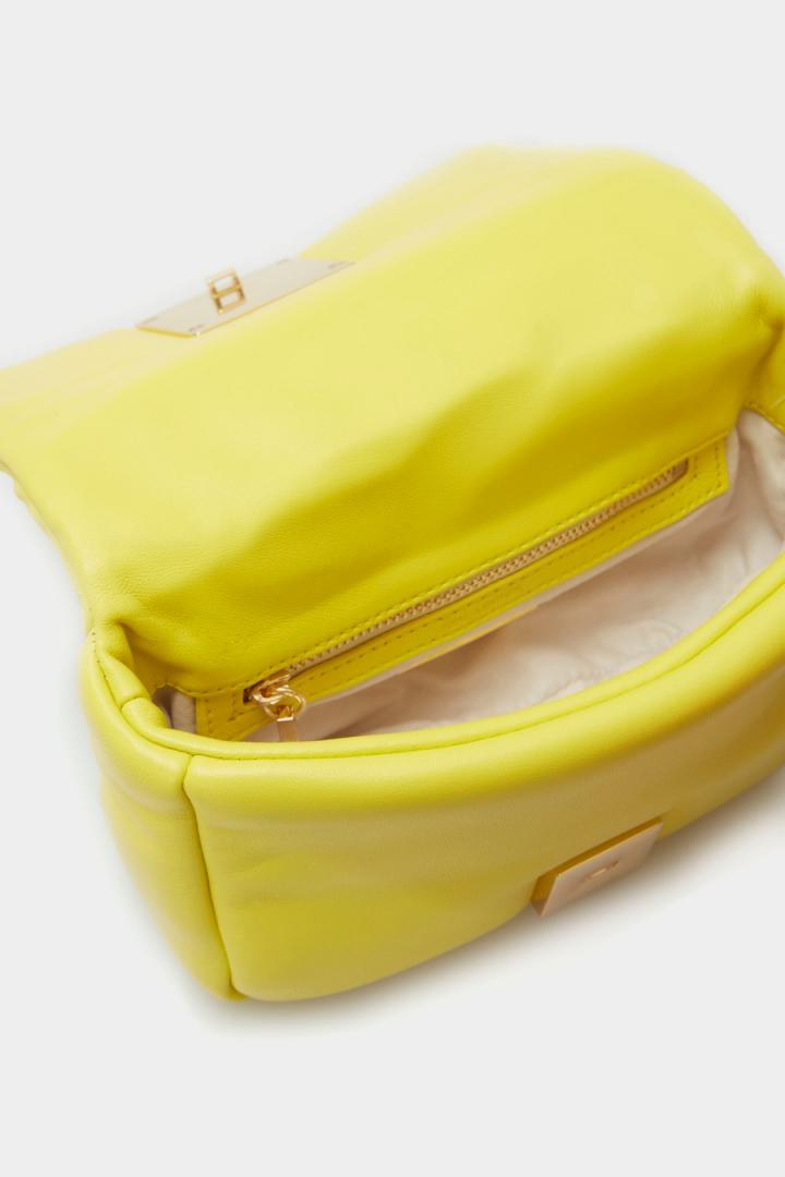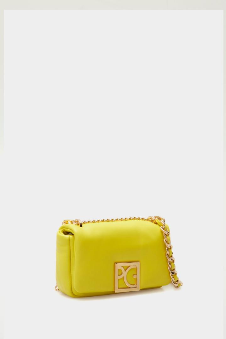 Bolso bandolera pequeño en piel de napa. Cierre de solapa con placa metálica en forma de cubo PG y asa bandolera de dos posiciones de cadena trenzada con piel. Interior con forro completo y un bolsillo con cierre de cremallera.