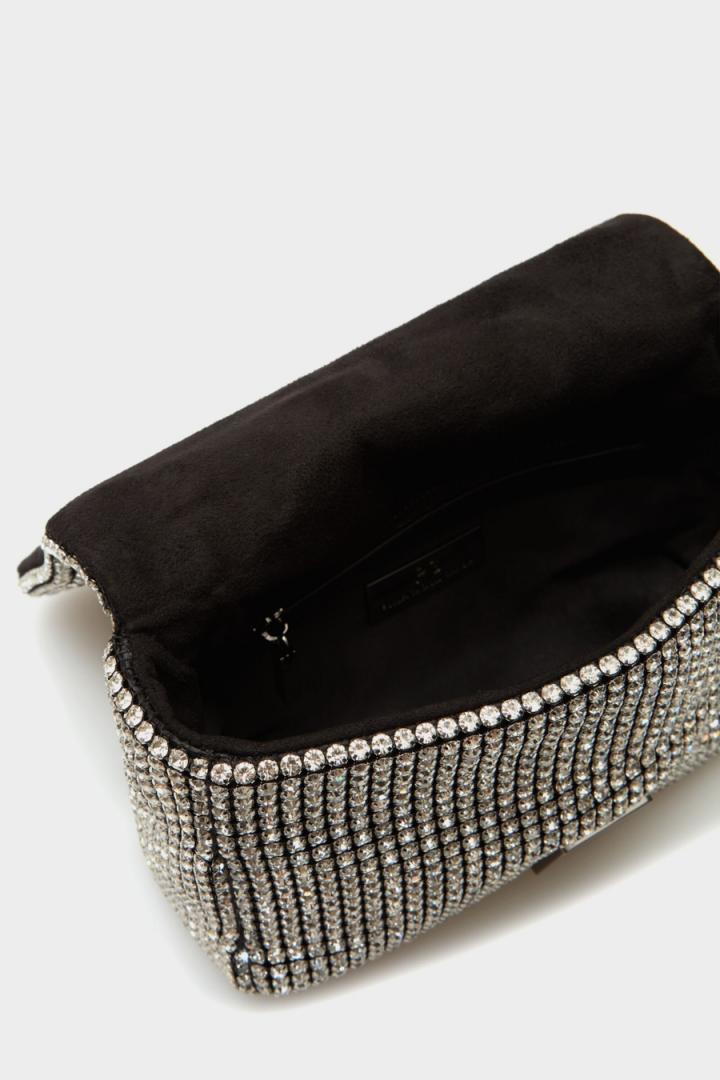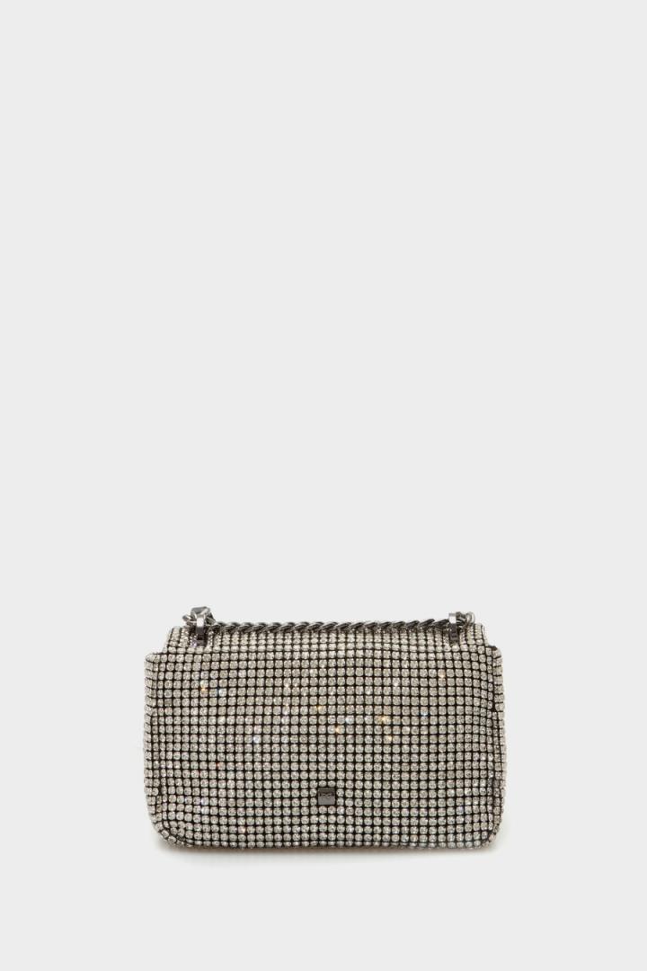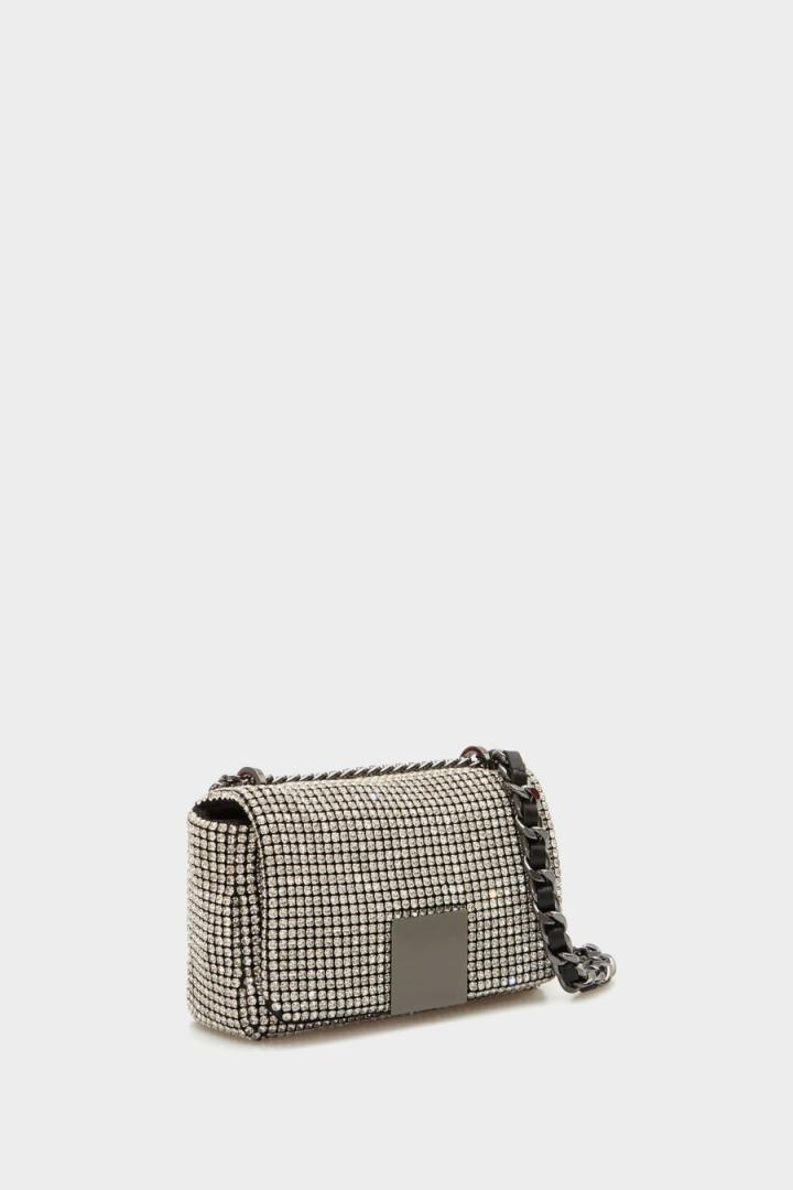 Bolso bandolera en tejido con acabado de cristales. Cierre de solapa personalizado con placa metálica en forma de cubo. Asa combinada de cadena y piel trenzada de dos posiciones. Interior con forro completo y un bolsillo de cremallera.