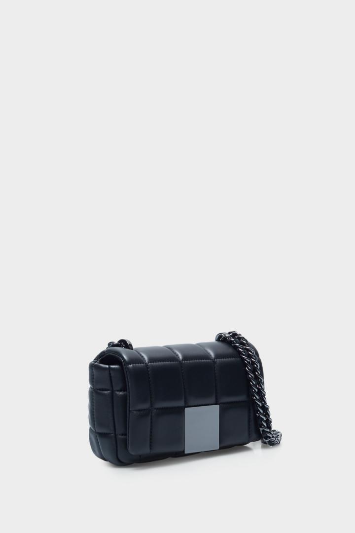 Bolso bandolera elaborado en piel de napa con diseño acolchado Pop y cierre de solapa personalizado con placa metálica en forma de cubo. Asa combinada en piel y cadena de dos posiciones. Forro completo y bolsillo interior con cremallera.