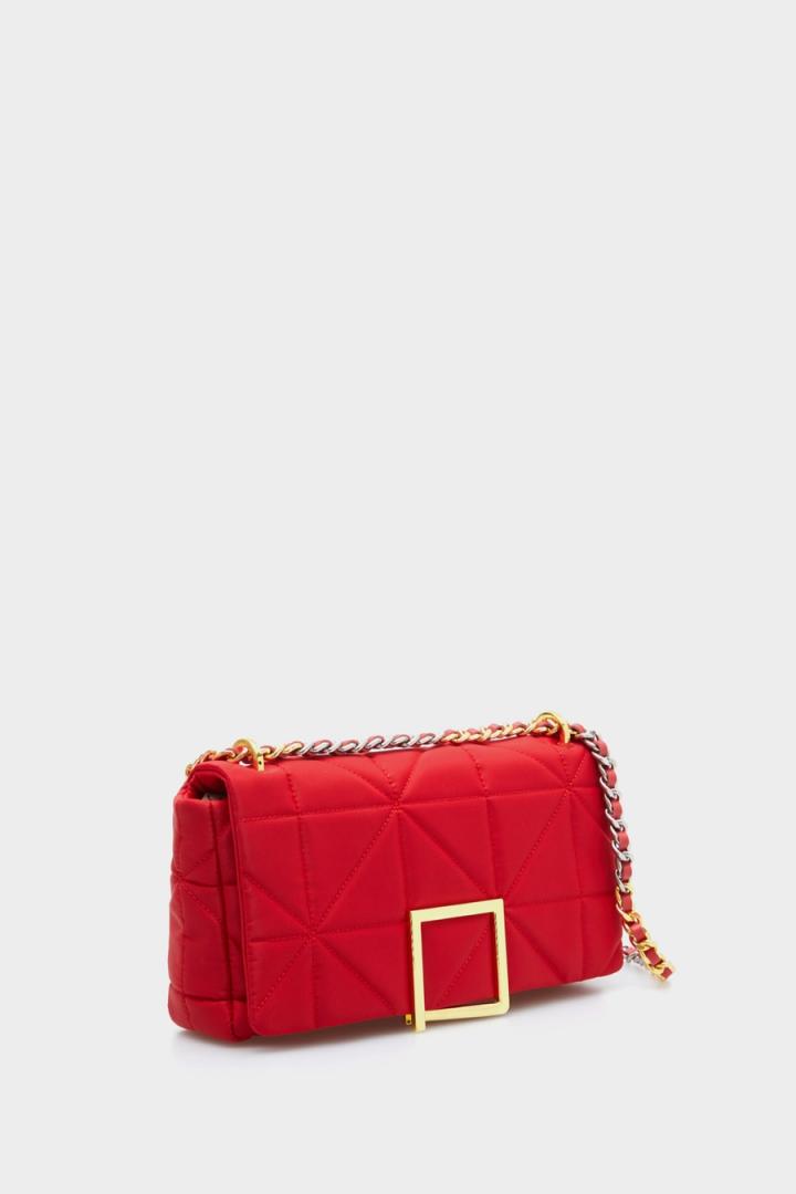 Bolso bandolera en nylon con diseño acolchado Pop Origami. Cierre de solapa personalizado con una placa metálica en forma de cubo y asa combinada en piel y cadena de dos tonos. Interior con forro completo y un bolsillo de cremallera.