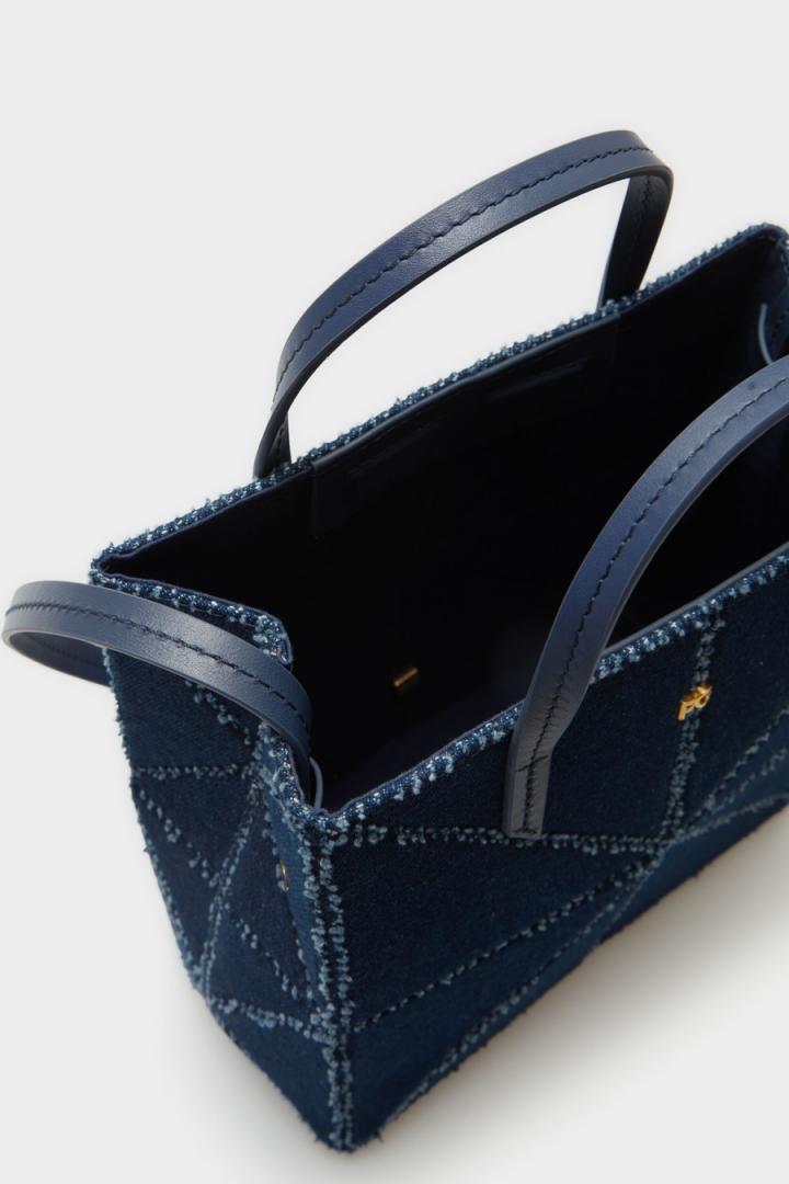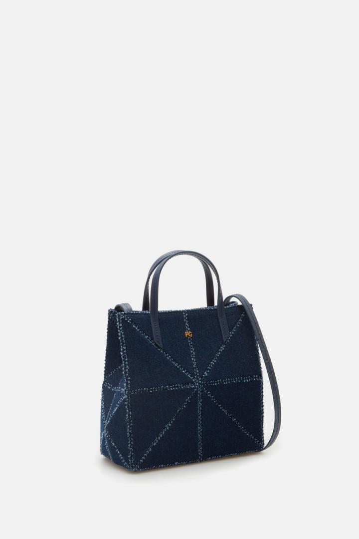 Bolso bandolera pequeño en denim de algodón con diseño Origami y ribetes desflecados. Dos asas de mano y asa bandolera ajustable a tono. Cierre magnético e interior con forro completo de algodón.