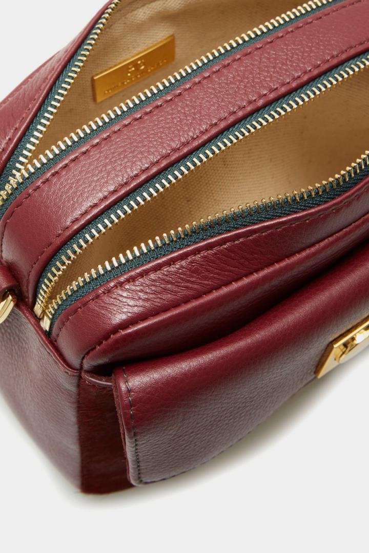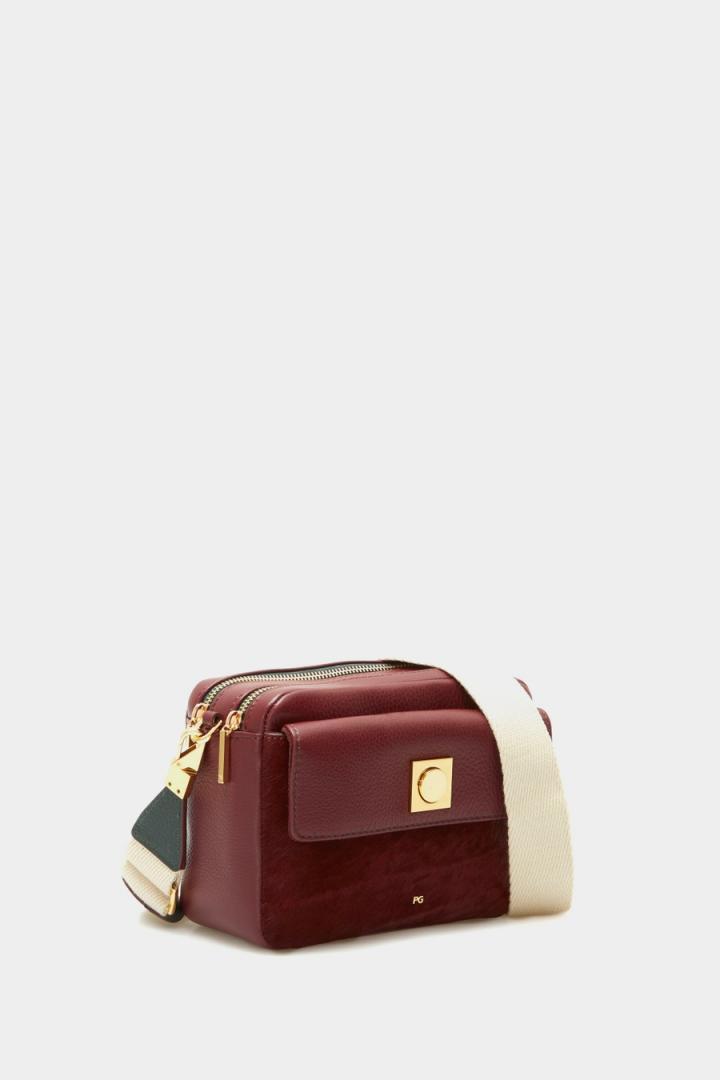 Bolso bandolera pequeño en piel con panel delantero con acabado de pelo a tono. Cierre de cremallera y asa bandolera regulable y extraíble de grosgrain. Dos compartimentos con forro completo de lino y algodón. Bolsillo exterior con cierre de solapa y pulsador.