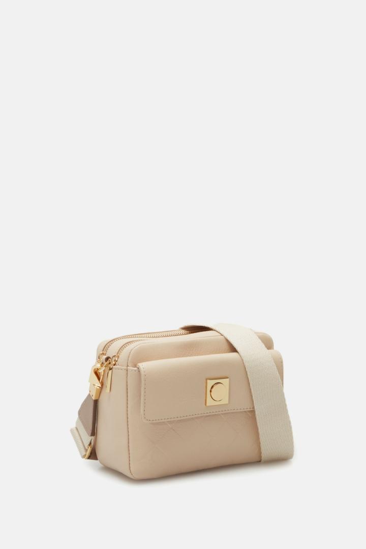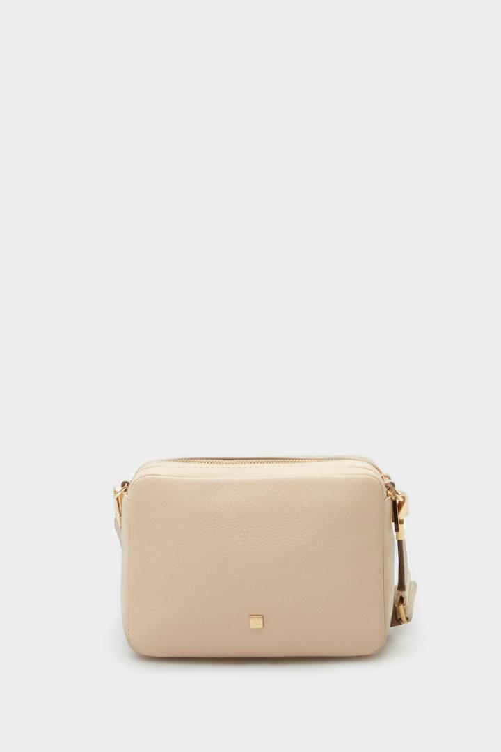 Bolso bandolera pequeño en piel con grabado Stamp de cubos y logos PG. Cierre de cremallera y asa bandolera regulable y extraíble de grosgrain. Dos compartimentos con forro completo de algodón y lino. Bolsillo exterior con cierre de solapa y pulsador.