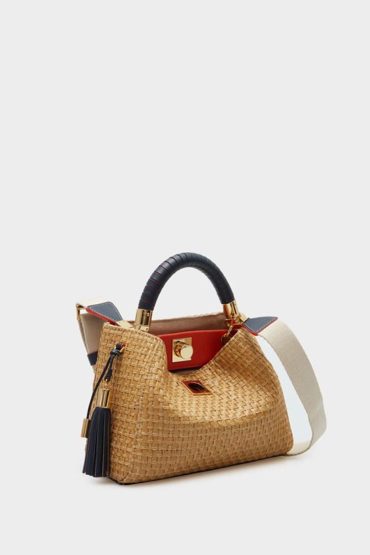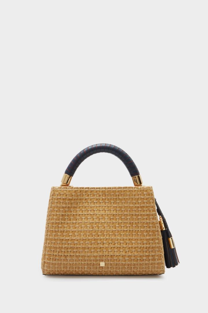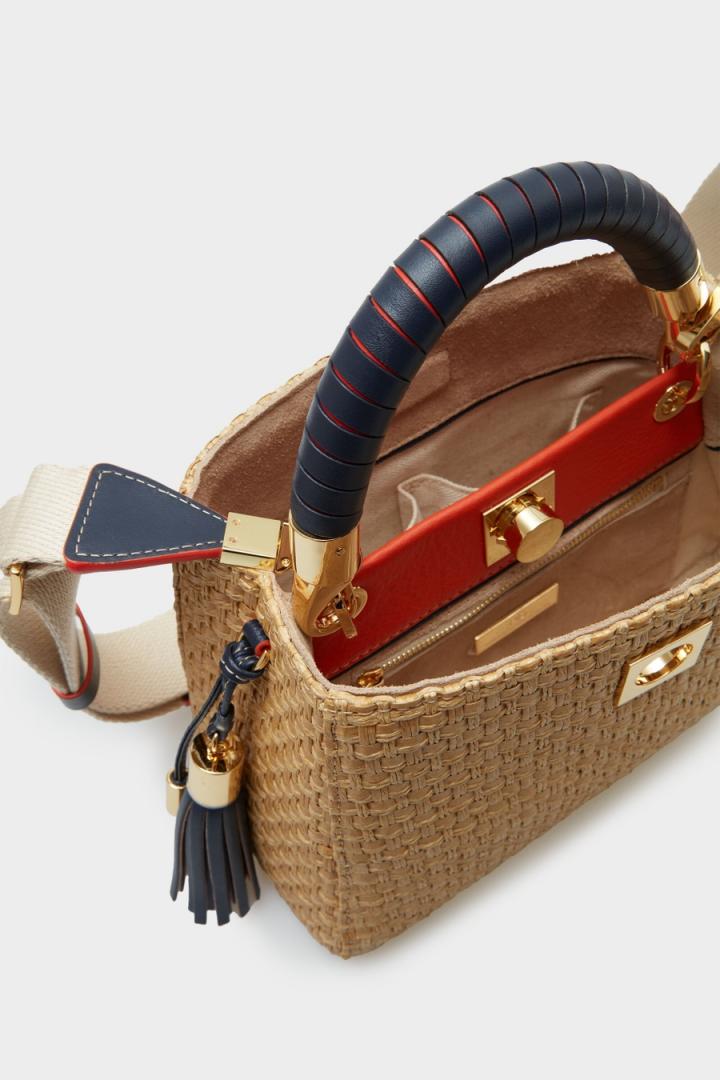 Bolso bandolera pequeño en fibra de papel trenzada con borla en piel a contraste en el lateral. Asa de mano de piel a contraste y asa bandolera de grosgrain a contraste extraíble y ajustable. Cierre de pulsador e interior con forro completo en algodón y lino dividido en dos compartimentos. Bolsillo interior con cierre de cremallera y dos bolsillos tipo tarjetero. Detalle de cubo metálico con logo PG grabado en la parte posterior.