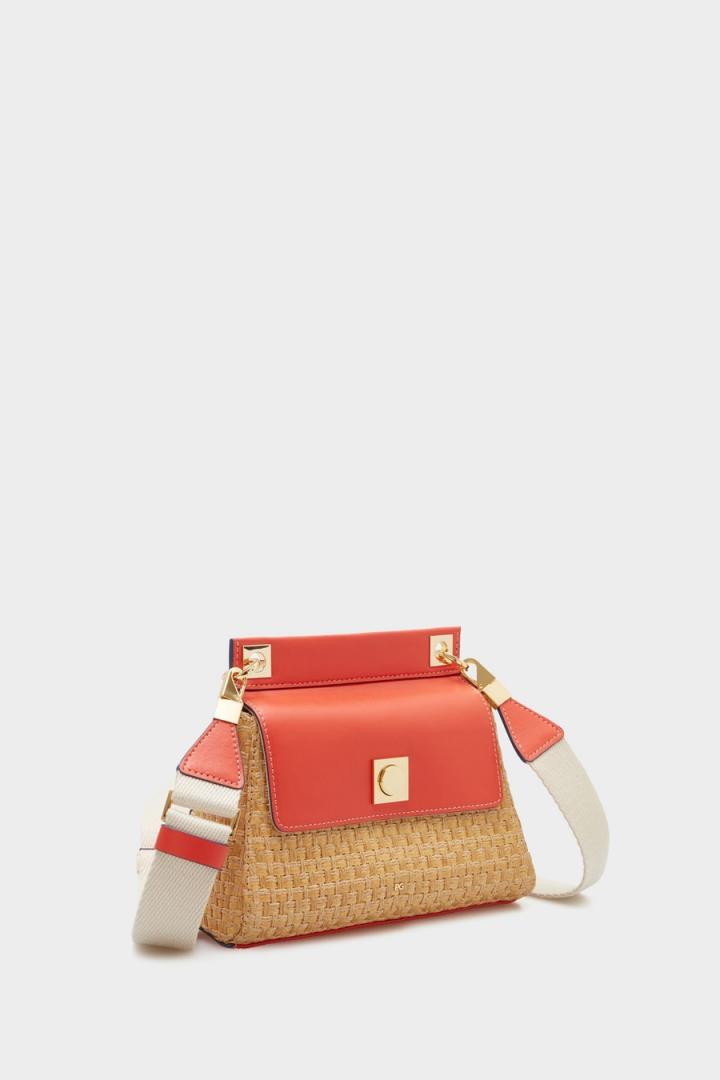 Bolso bandolera pequeño en fibra de papel trenzada y piel a contraste. Cierre de solapa con pulsador y asa bandolera extraíble y regulabl…
