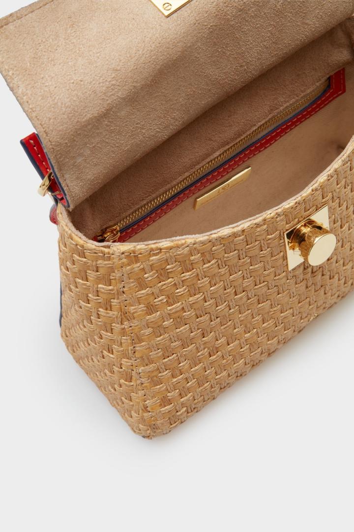 Bolso bandolera pequeño en fibra de papel trenzada y piel a contraste. Cierre de solapa con pulsador y asa bandolera extraíble y regulable en grosgrain. Interior con forro completo de algodón y lino y un bolsillo con cierre de cremallera. Detalle de cubo metálico con logo PG grabado en la parte posterior.