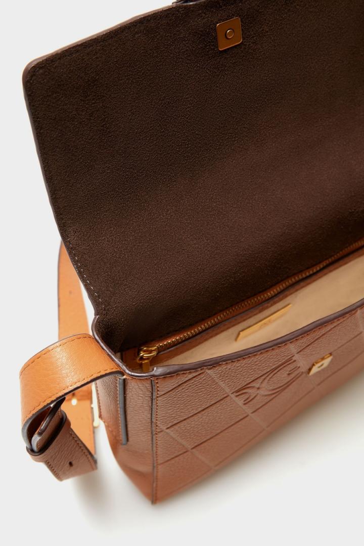 Bolso bandolera en piel con maxi grabado de cubos y logo PG. Asa de mano en piel. Solapa personalizada con cierre de metálica en forma de cubo. Interior con forro completo y bolsillo de cremallera.