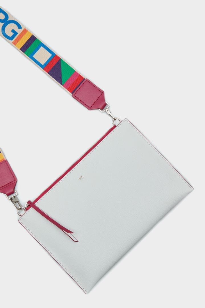 Bolso bandolera pequeño en piel doble faz. Asa bandolera extraíble de grosgrain estampado con Cinta PG multicolor a contraste. Cierre de cremallera a contraste con tirador de piel bicolor e interior en piel a contraste. Detalle de logo PG y cubo metálico en la parte delantera y posterior.