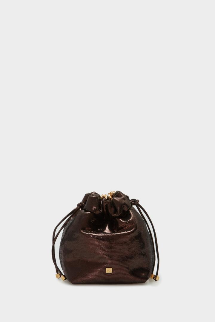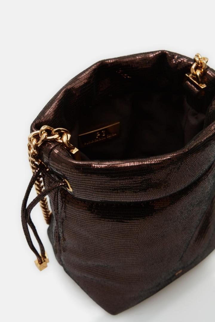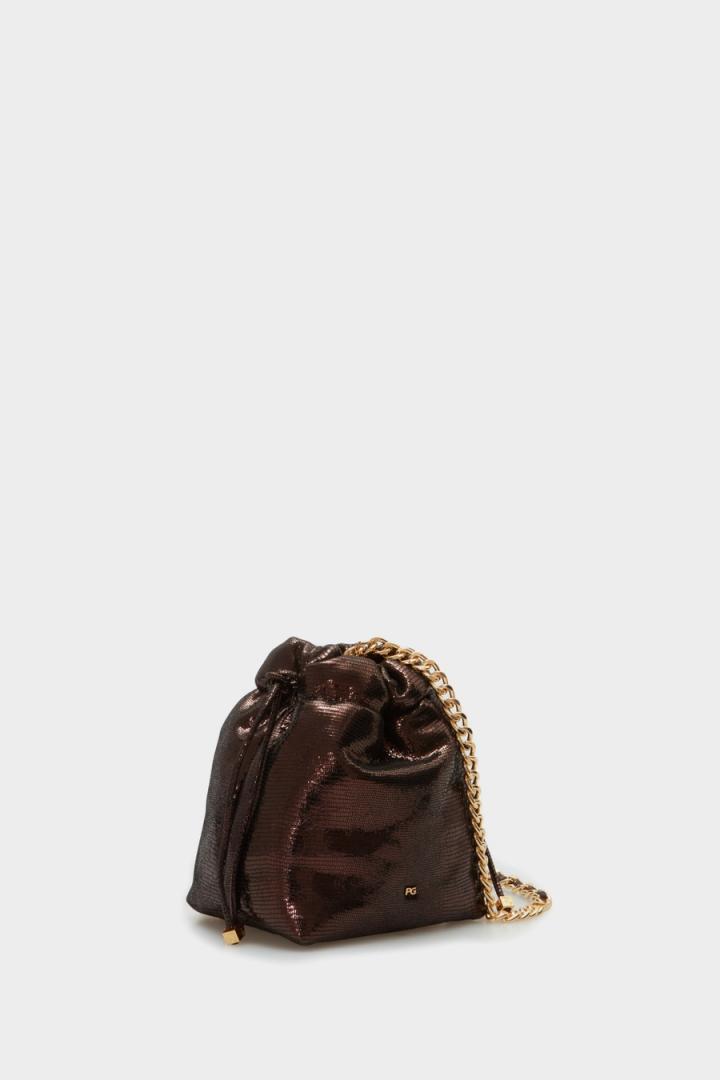 Bolso bombonera pequeño en piel de napa con acabado metalizado. Asa bandolera de cadena y piel y cierre de frunce. Interior con forro completo.