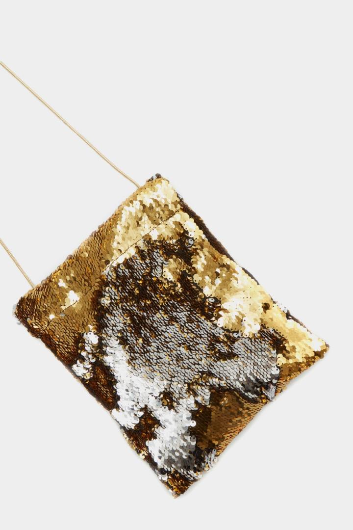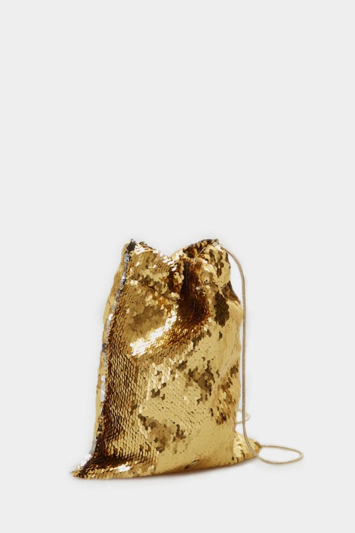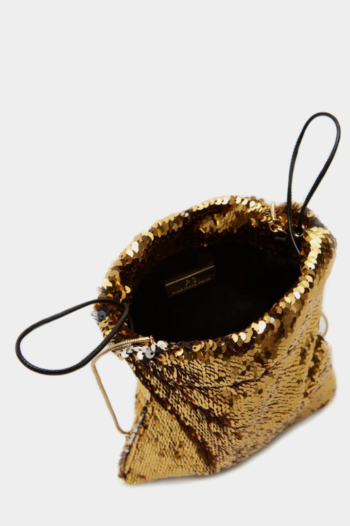Bolso bombonera bandolera pequeño de lentejuelas. Asa bandolera de cadena y cierre de frunce. Interior con forro completo de tejido a contraste.