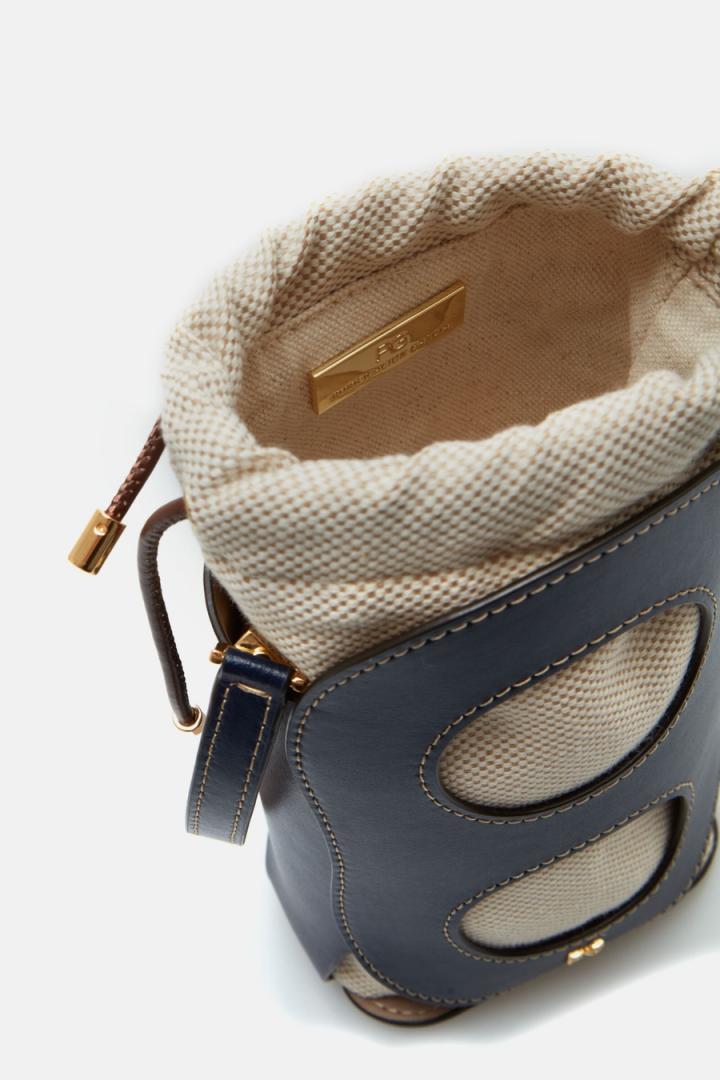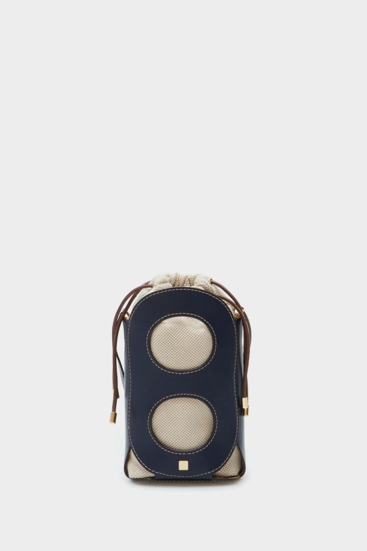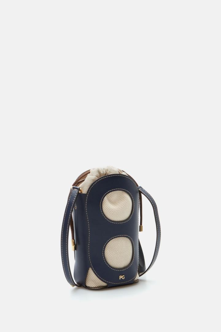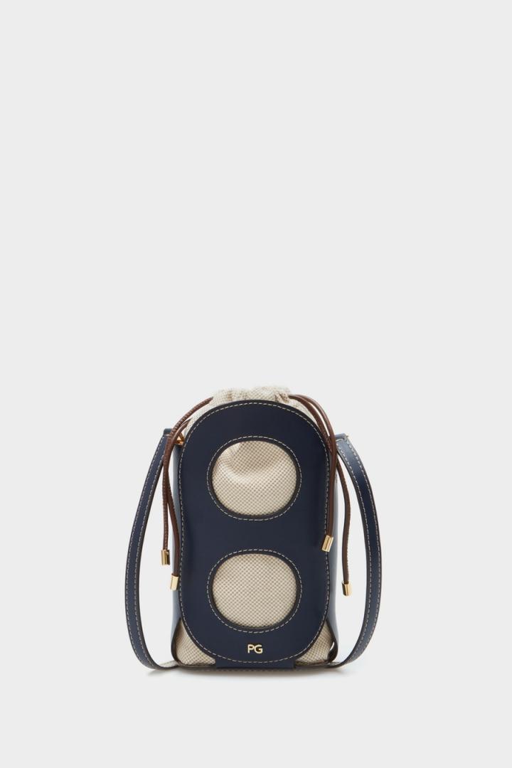 Bolso bombonera pequeño en piel con diseño Ocho troquelado y pespuntes a contraste. Asa bandolera de piel a tono y pouch interior de lino y algodón con cierre de frunce. Detalle de logo PG metálico en el delantero y cubo metálico con logo PG grabado en la parte posterior.
