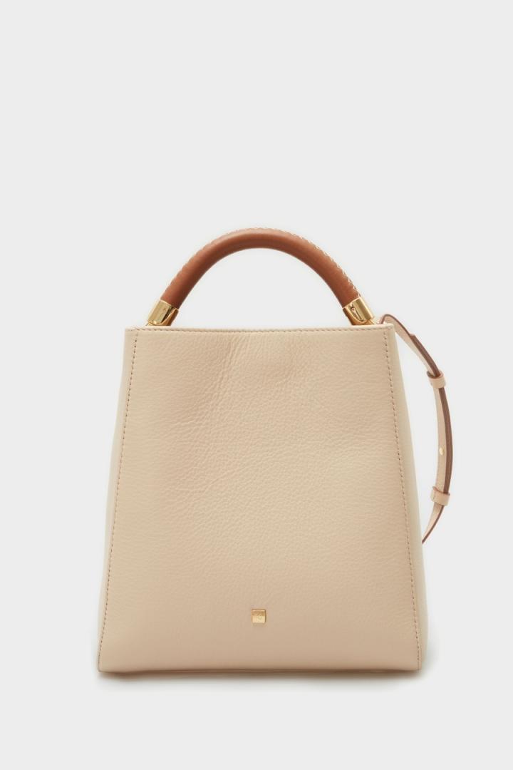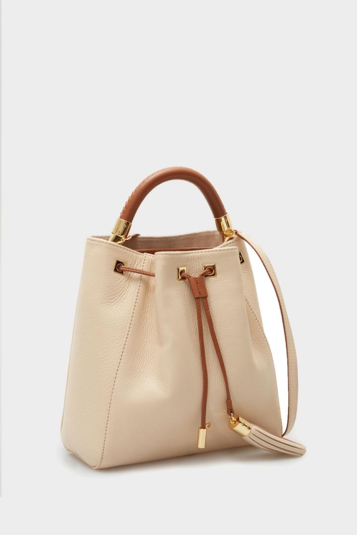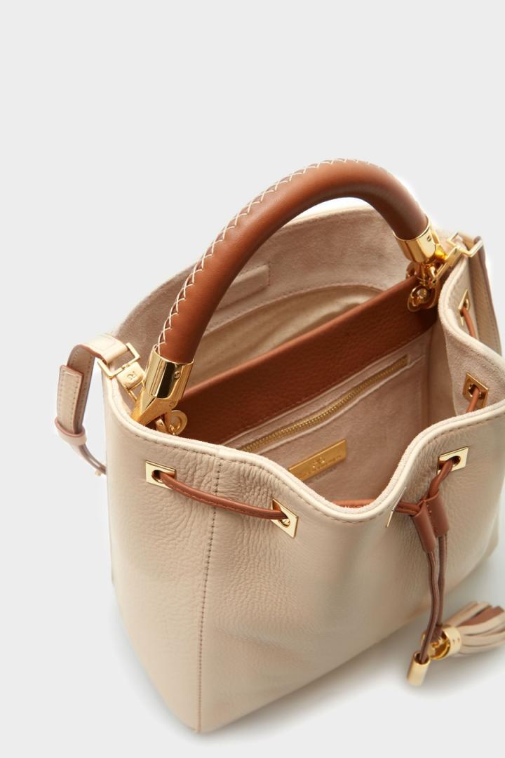 Bolso bombonera mediano en piel con detalle de borla de piel a tono. Cierre de frunce de piel a contraste, asa de mano extraíble y asa de hombro extraíble y regulable, ambas de de piel. Interior con forro completo de algodón y lino dividido en dos compartimentos con un bolsillo de cremallera.