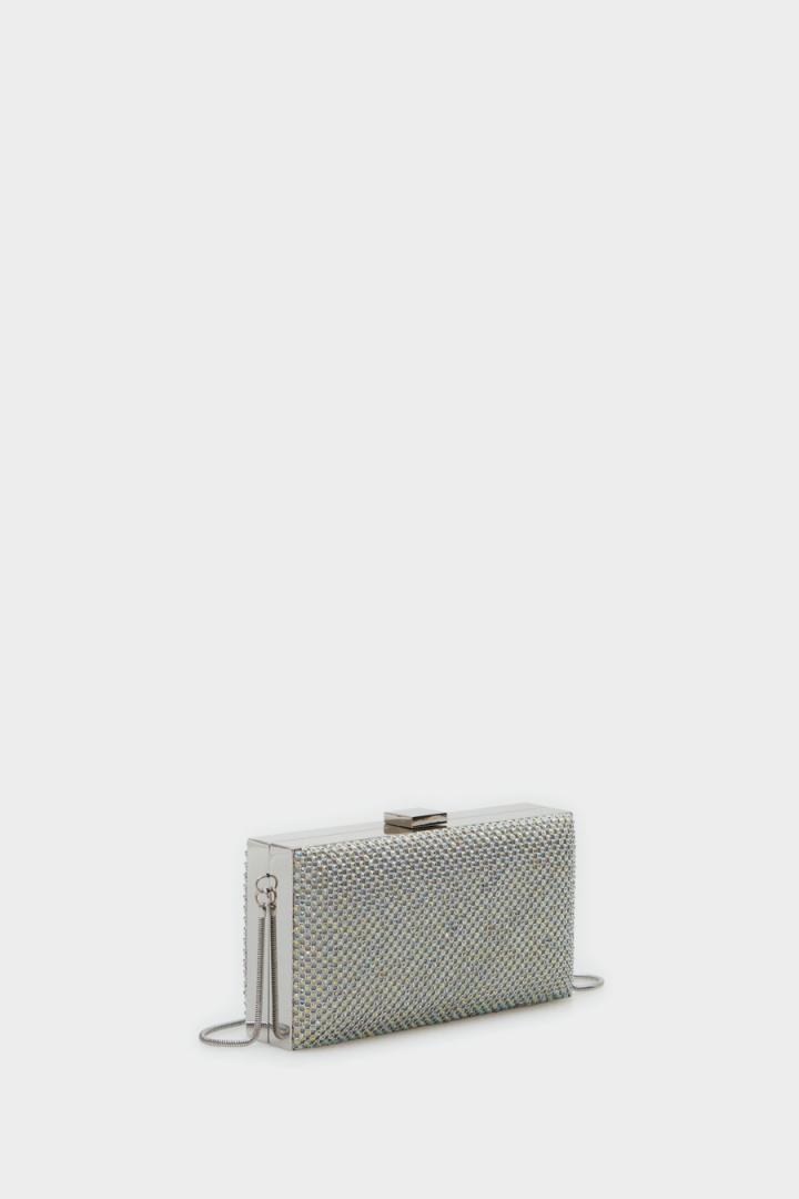 Bolso en forma de caja rectangular de metal con acabado de cristales. Cierre de presión, asa de cadena tipo serpiente e interior de tejido.