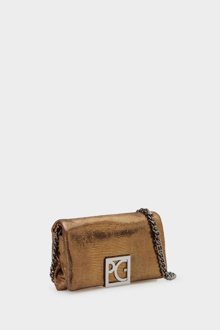 Clutch en piel napa con cierre de solapa personalizado con placa metálica en forma de Cubo PG, diseño metalizado y asa bandolera de cadena. Forro completo de tejido a contraste….