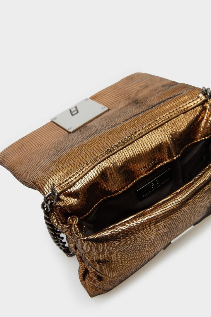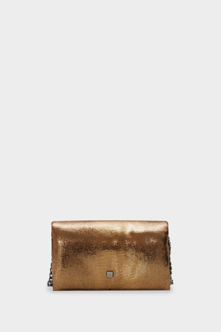 Clutch en piel napa con cierre de solapa personalizado con placa metálica en forma de Cubo PG, diseño metalizado y asa bandolera de cadena. Forro completo de tejido a contraste.