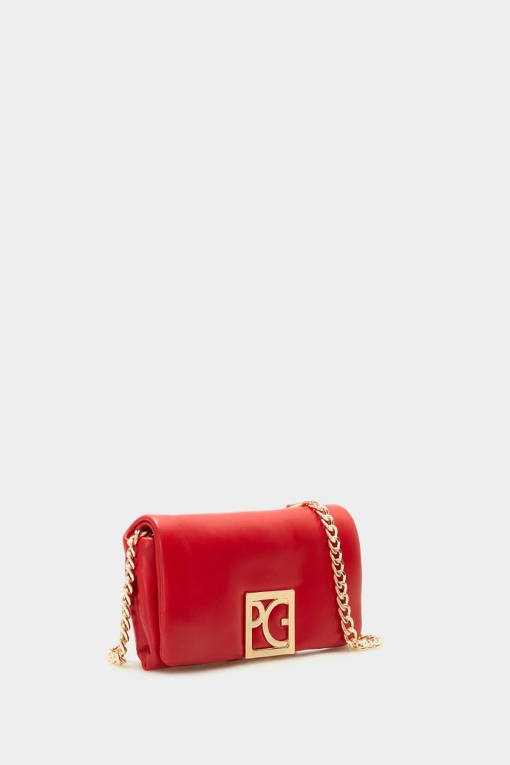 Clutch de piel napa con cierre de solapa personalizado con placa metálica en forma de cubo PG y asa bandolera de cadena. Forro completo de tejido a contraste….
