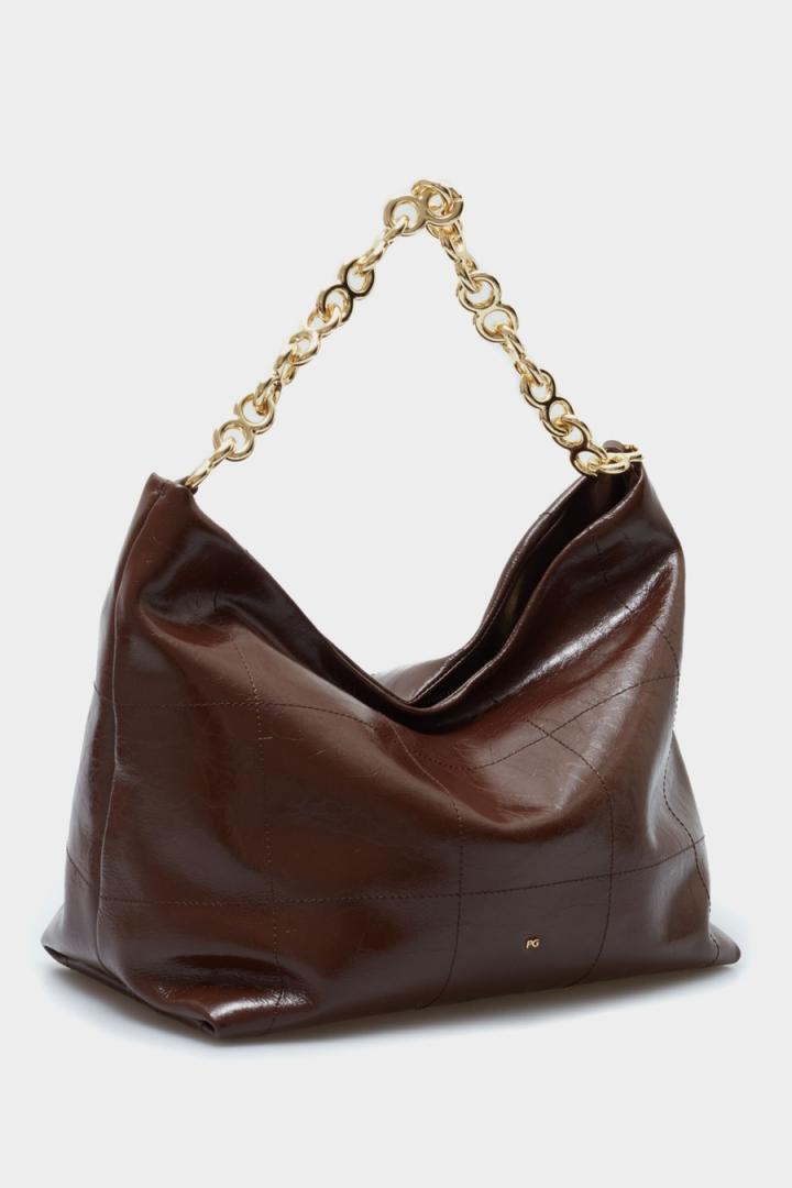 Bolso de hombro grande en piel con diseño pespunteado de cubos a tono y logo PG metálico. Cierre de cremallera y asa de cadena de Ochos. Interior con forro completo de algodón y lino y un bolsillo de cremallera. Detalle de logo cubo metálico en la parte posterior.