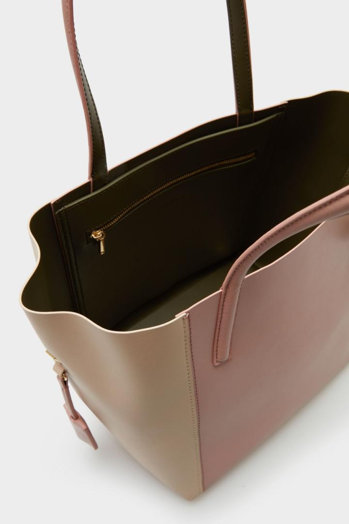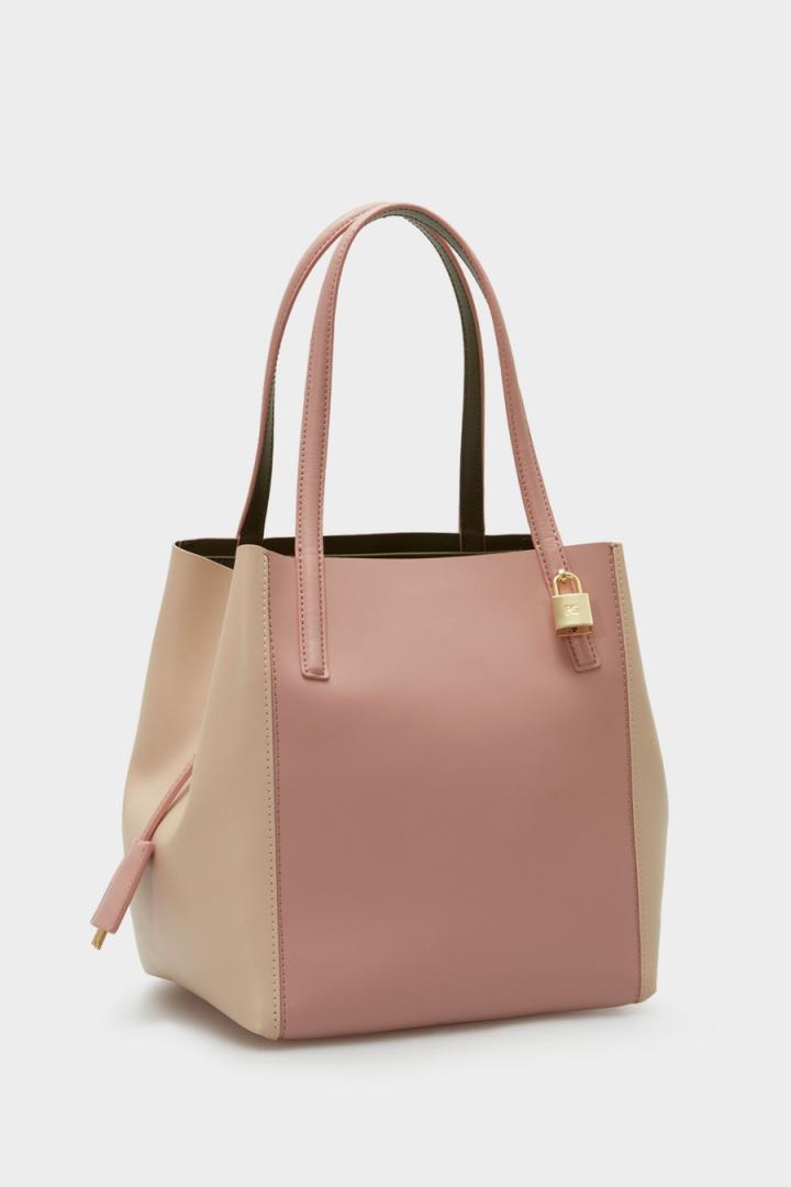 Bolso de hombro mediano en piel con detalle de candado metálico personalizado y llavero de piel a tono. Dos asas de piel e interior de piel con cierre de tira con broches y un bolsillo de cremallera.